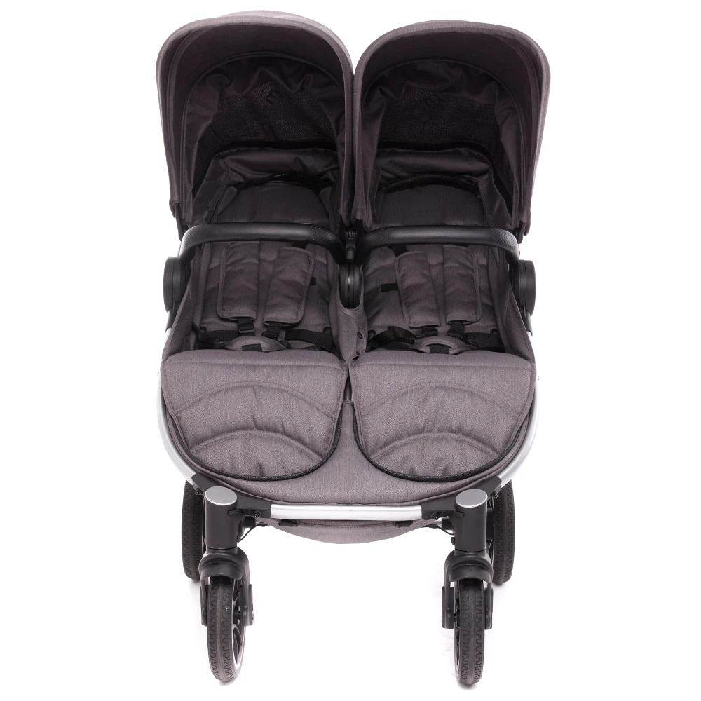 4-wheel suspension, wheel bearings, durable solid rubber tyres and lockable swivel wheels ensure a smooth ride over multiple terrains and a comfortable push, even for taller parents thanks to the adjustable handle height. Spacious 22kg capacity seats with adjustable calf supports, one-hand reclining ventilated backrests and removable bumper bars makes the Easy Twin 4.0 ideal for curious passengers or naps on the go. Extra-large, UPF50, water repellent canopies and the included rain cover give versatility whatever the weather.
