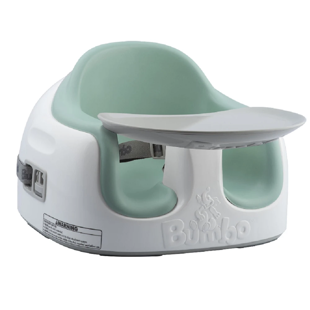 The Bumbo multi seat can be used in three stages, adapting it to the growing needs of your child. You can use it as a floor seat.  You can strap it to an adult chair for feeding time in place of using a highchair. you can use it as a booster by removing the pad. It has a stow away tray which is easily detached and manoeuvred with one hand to slot away neatly behind the backrest of the seat.