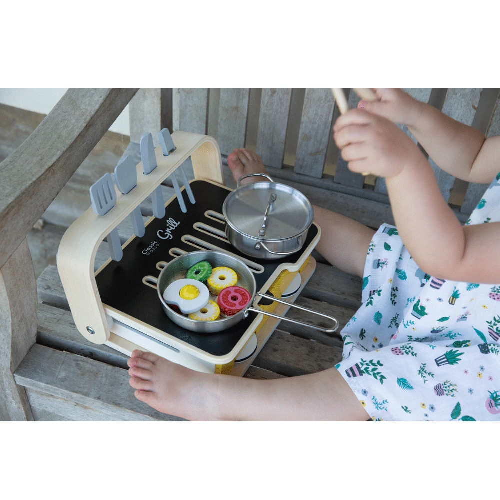 This Classic World 2 In 1 Tabletop Kitchen is small but mighty and portable! The grill top flips over to reveal an entirely new way of cooking. One side inspires children to cook on a stove, the other takes them outside to learn how to bbq on a grill! They can even turn the grill on by flipping a little switch to reveal glowing red beneath the tabletops.