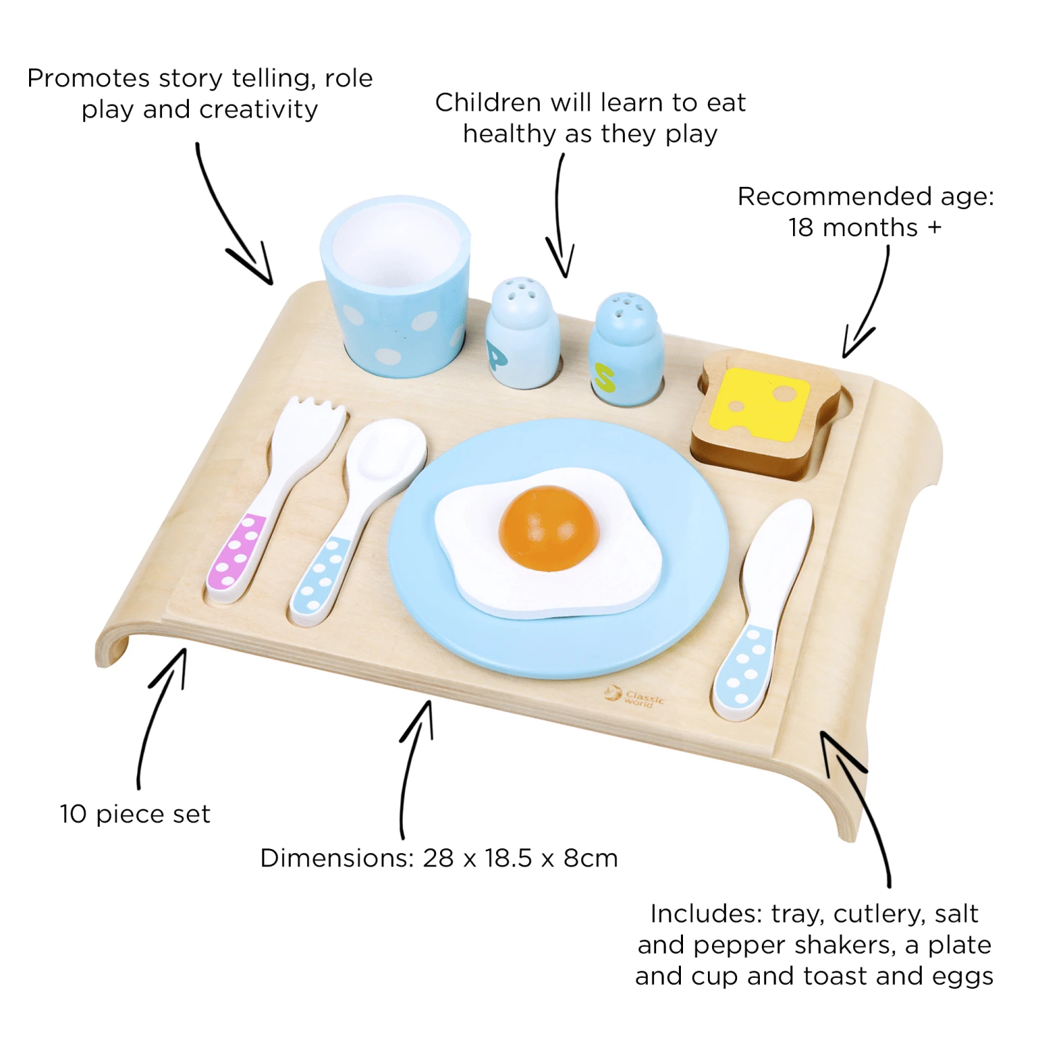 Promote story telling, role play and creativity with our Classic World Breakfast Set. Children will learn to eat healthy as they play.