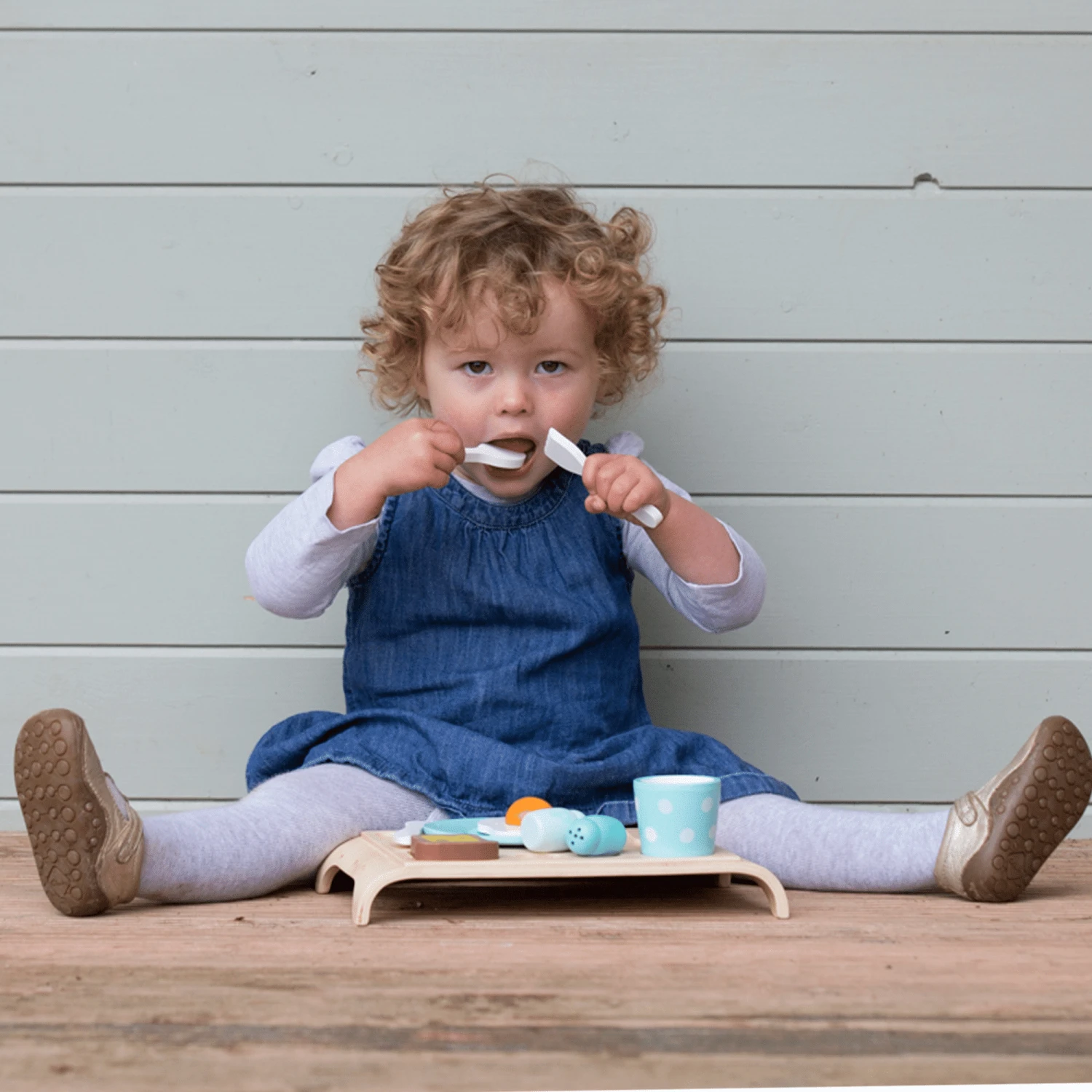 The set includes a breakfast tray, a full set of cutlery, little salt and pepper shakers, a plate and cup and some toast and eggs.