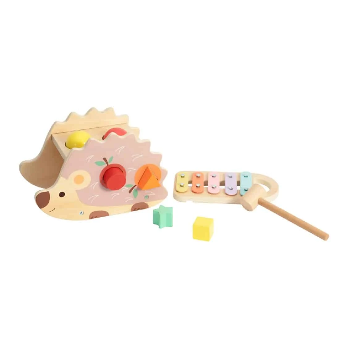 This charming little pink Classic World Hedgehog Pounding Bench will provide hours of fun for your little one. The wooden balls can be hammered through the gaps and onto the xylophone to make unique noises. The xylophone can be detached and used just with the hammer for more purposeful sounds. The blocks can also be pushed through the specifically shaped holes in the hedgehog. All this makes for an engaging toy that will encourage fine motor skill development and provide hours of entertainment.