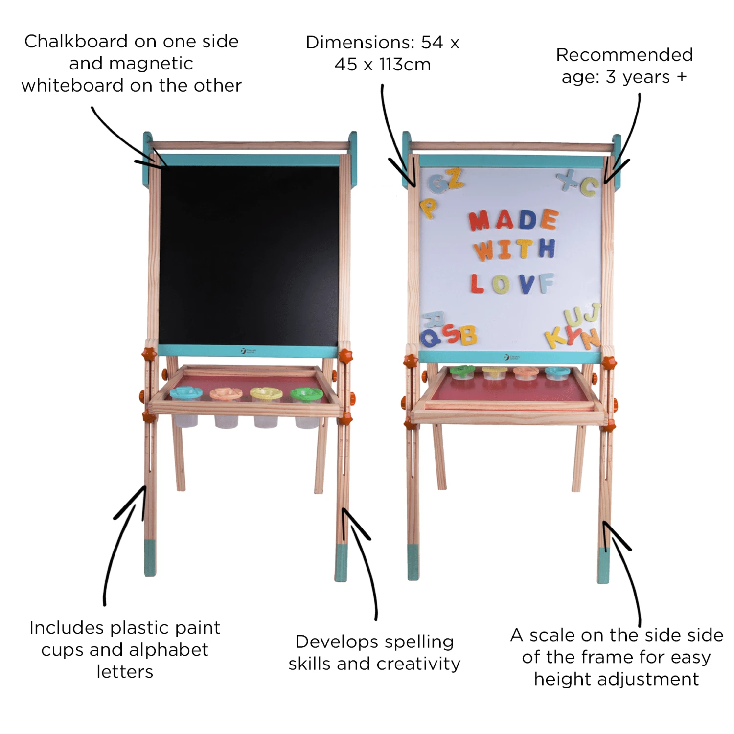 This Classic World Multi Functional Easel is a foldable easel. It has a chalkboard and magnetic whiteboard for children to create nice drawings. There is a scale on the side of the frames for easy height adjustment. It also includes plastic paint cups and magnetic English alphabet letters.