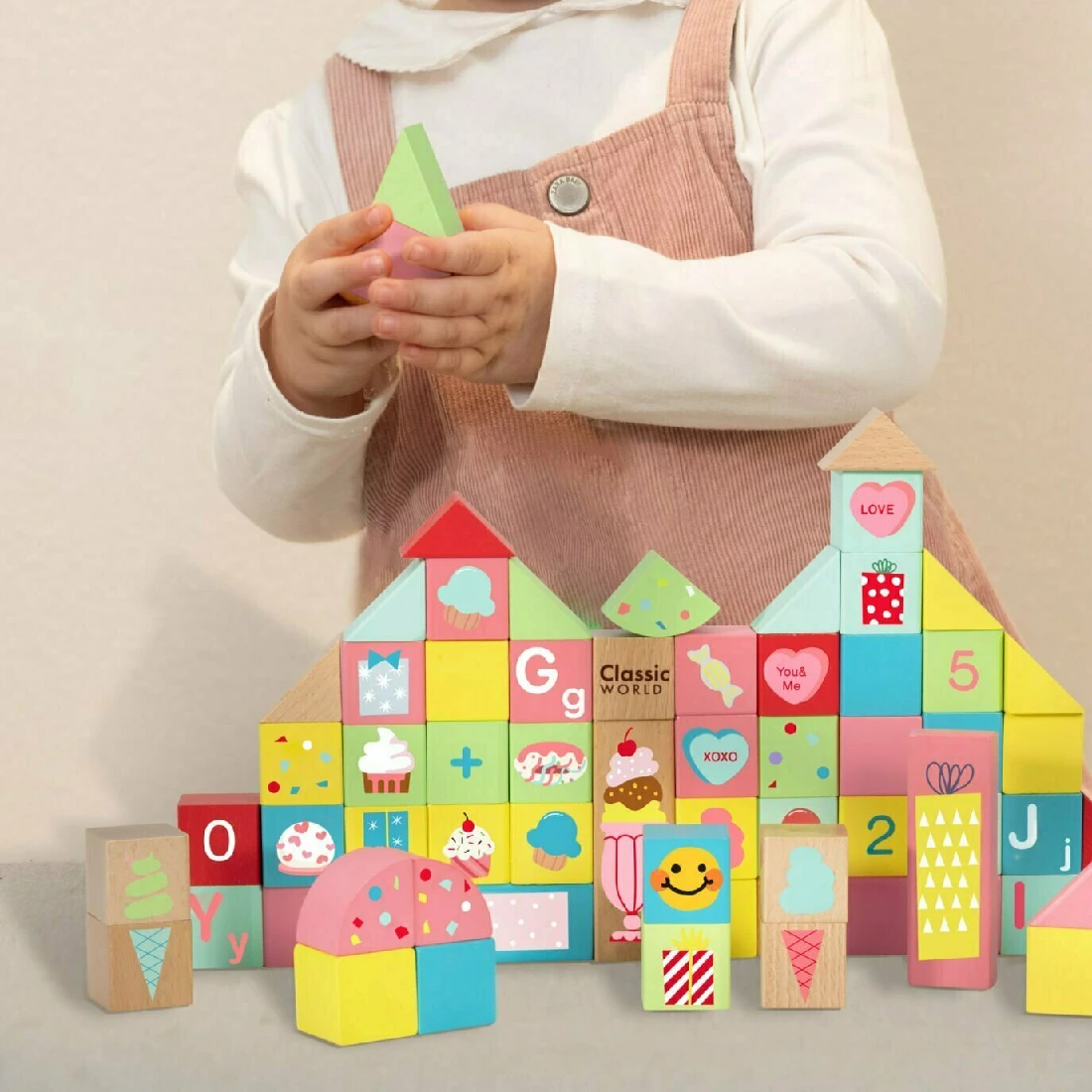 These charming, brightly coloured Classic World Sweet Cube Blocks wooden shape blocks are a key part of any child’s early learning and development. Your little one will love building, creating, and knocking down the different blocks whilst developing dexterity, coordination and imagination!