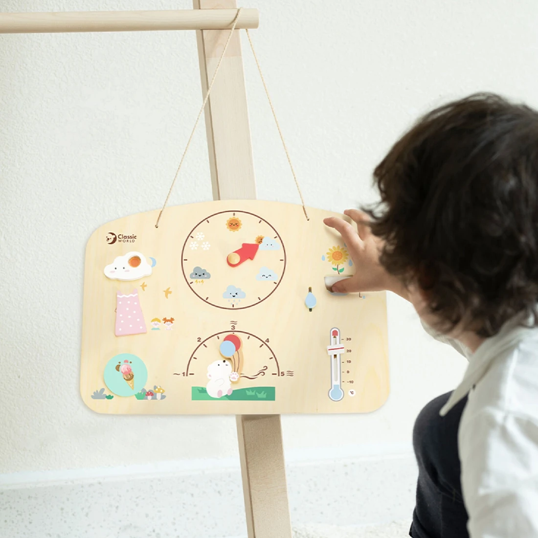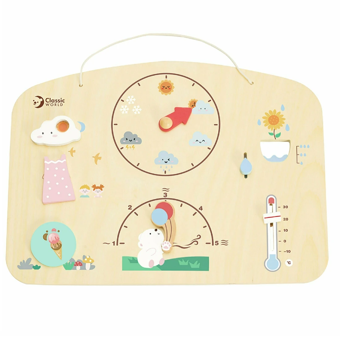From sunshine to thunderstorms and Summer to Winter, this interactive Classic World Wooden Barometer board has it all. What’s the weather right now? The temperature and what clothes match it? Or how about the season? Your youngster can learn more about nature as they have fun with the 9 piece creative set that also helps them form connections between different settings and objects.