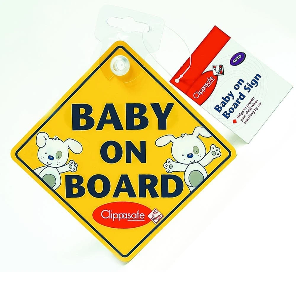 Clippasafe Auto Baby On Board Sign is printed on both sides. Baby on board on one side and Child on board on the other. Simply attaches to the rear windscreen with suction cup.