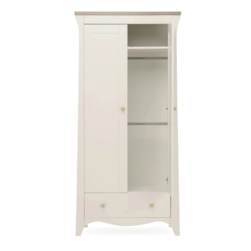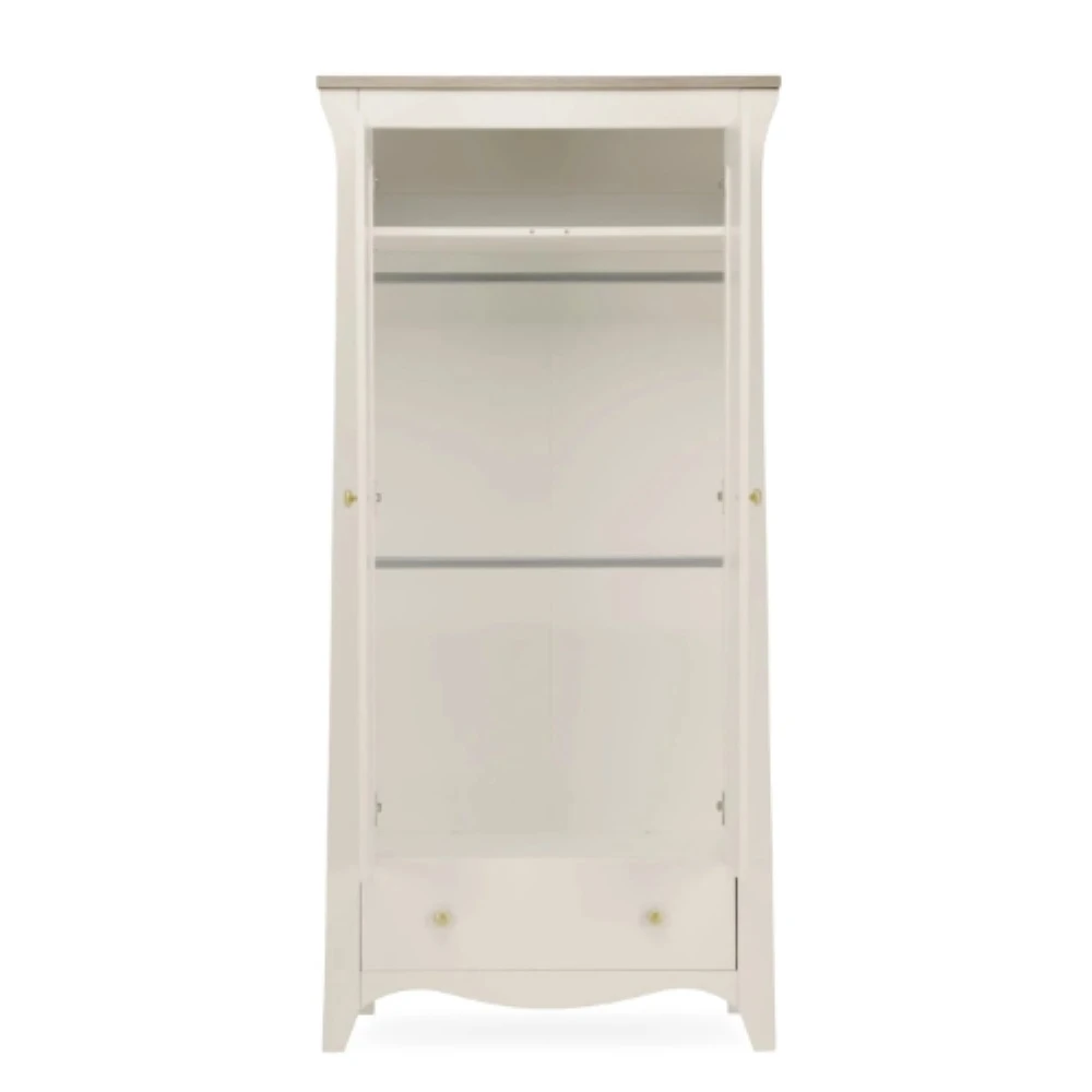 The Clara Nursery Wardrobe has ample room to keep your baby’s clothes organised. This double wardrobe has 2 removable hanging rails for keeping their tiny outfits neat and tidy. Inside the wardrobe is a deep shelf, perfect for storing baby bedding or blankets. Has a roomy drawer providing extra storage.