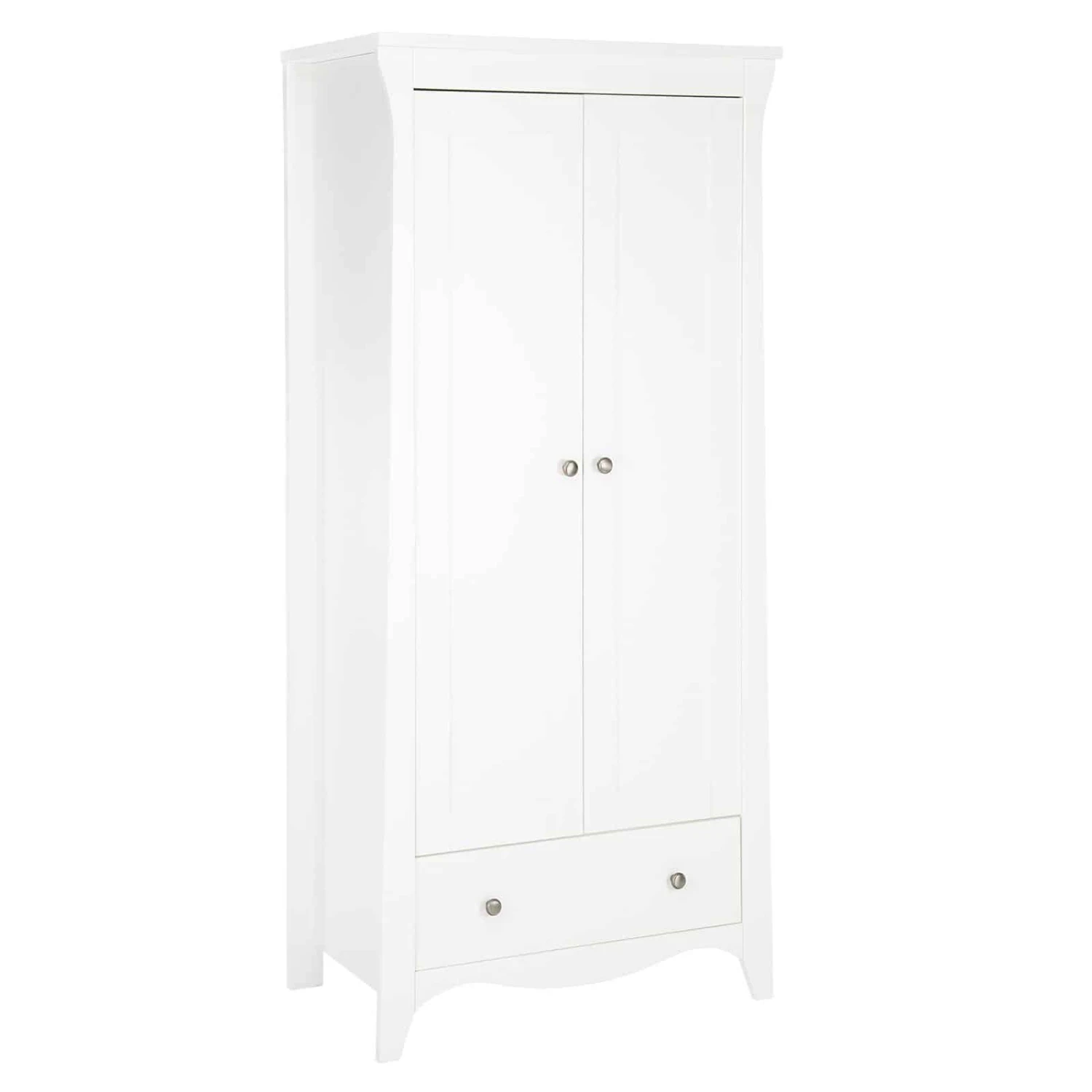The CuddleCo Clara Wardrobe is designed to successfully complete and organise your fairy tale nursery. This stylish double door wardrobe features a spacious interior with 2 removable full width hanging rails, top shelf and a large drawer at the bottom. Classic curved shapes and modern brushed metal handles add this wardrobe an extraordinary contrasting appearance. It comes with a wall strap kit for additional stability and safety. This furniture is carefully designed in Great Britain and made of solid pine and manufactured wood.