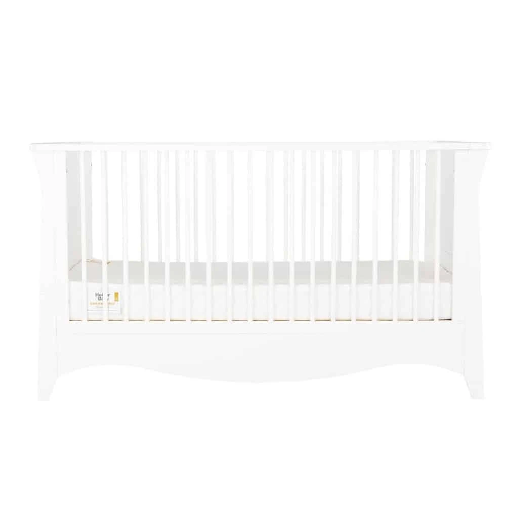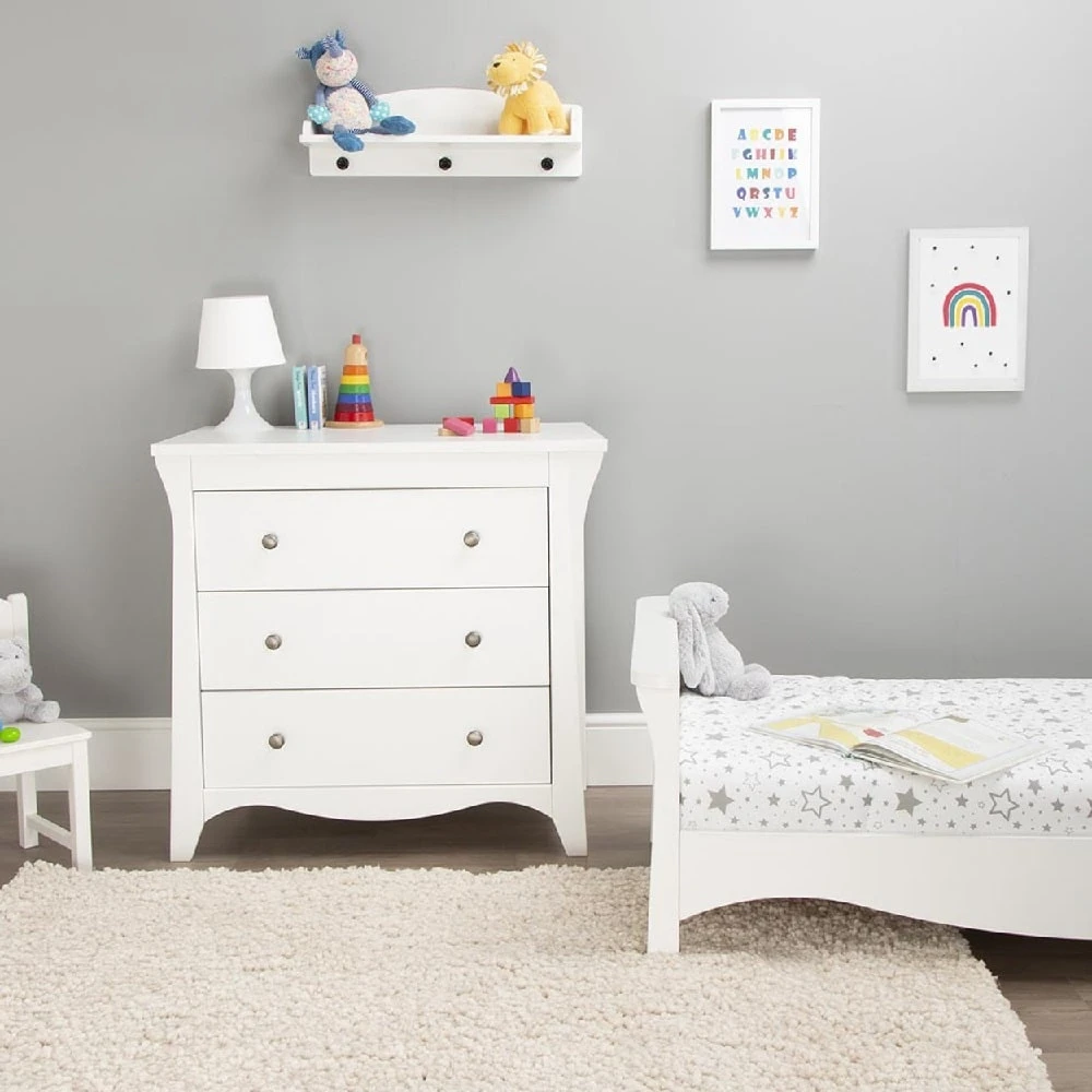 It’s classic curvature with a modern contemporary look, function and style to transform any nursery. The Clara full-size cot bed is suitable from birth to about 5 years. Designed with 3 mattress positions, the Clara cot bed easily converts into a modern and stylish toddler bed for years of enjoyment. The Clara 3 drawer dresser is designed to offer you style, storage and function with 3 spacious drawers and a removable changing station. The Clara 2 door double wardrobe is designed to successfully organise your nursery, with 2 removable hanging rails to convert into a full-size wardrobe, a deep storage drawer and a handy shelving space. Classic styling to transform a modern nursery. Designed to care, designed to last