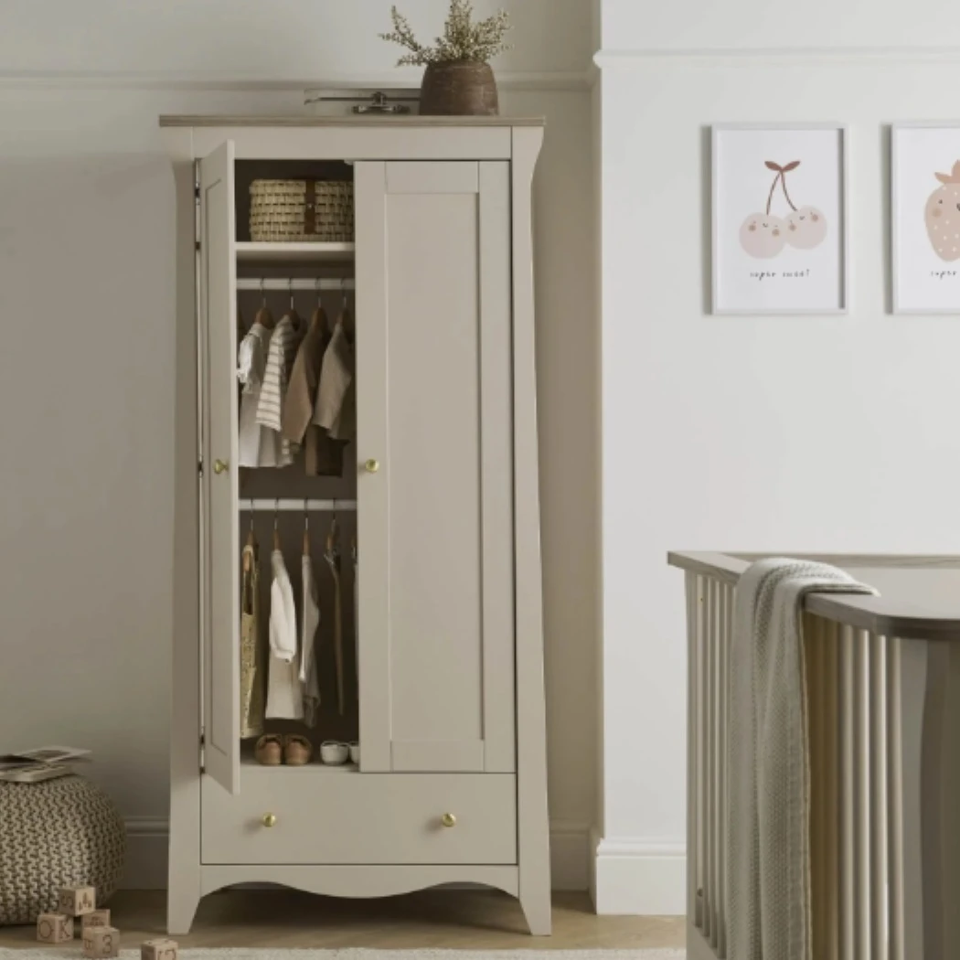 The Clara Nursery Wardrobe has ample room to keep your baby’s clothes organised. This double wardrobe has 2 removable hanging rails for keeping their tiny outfits neat and tidy. Inside the wardrobe is a deep shelf, perfect for storing baby bedding or blankets. Has a roomy drawer providing extra storage.