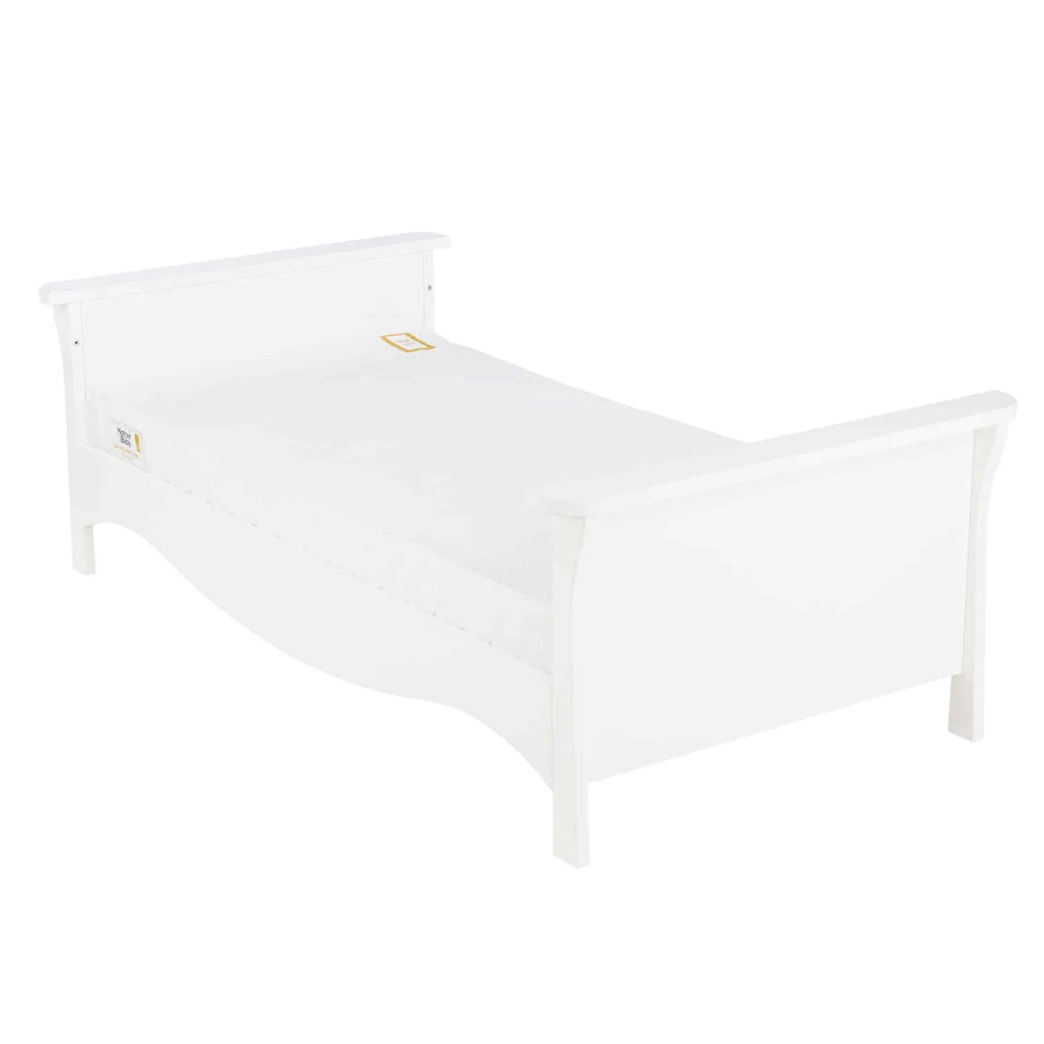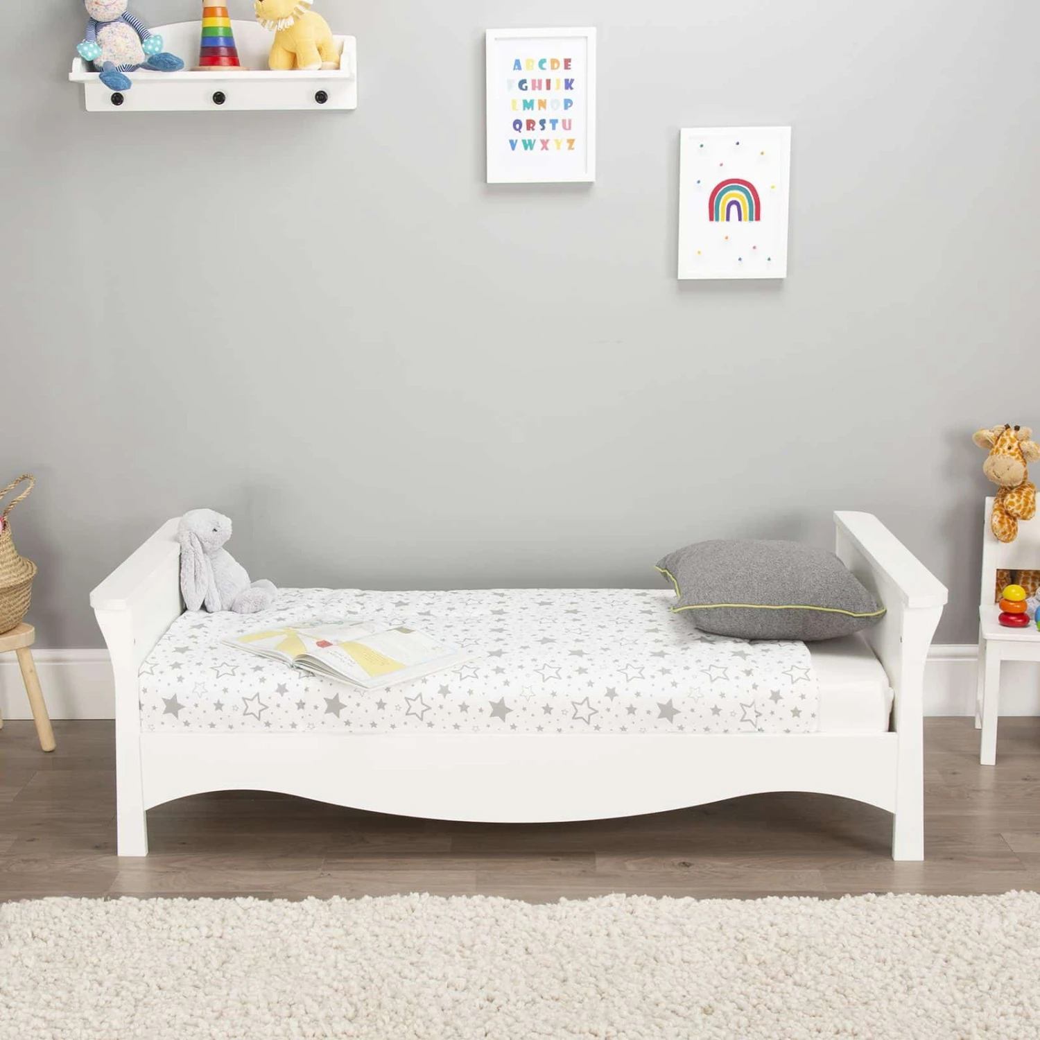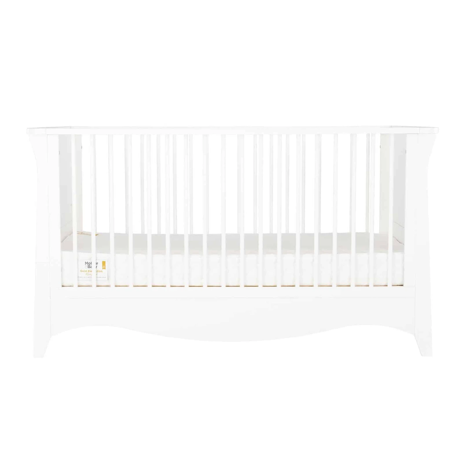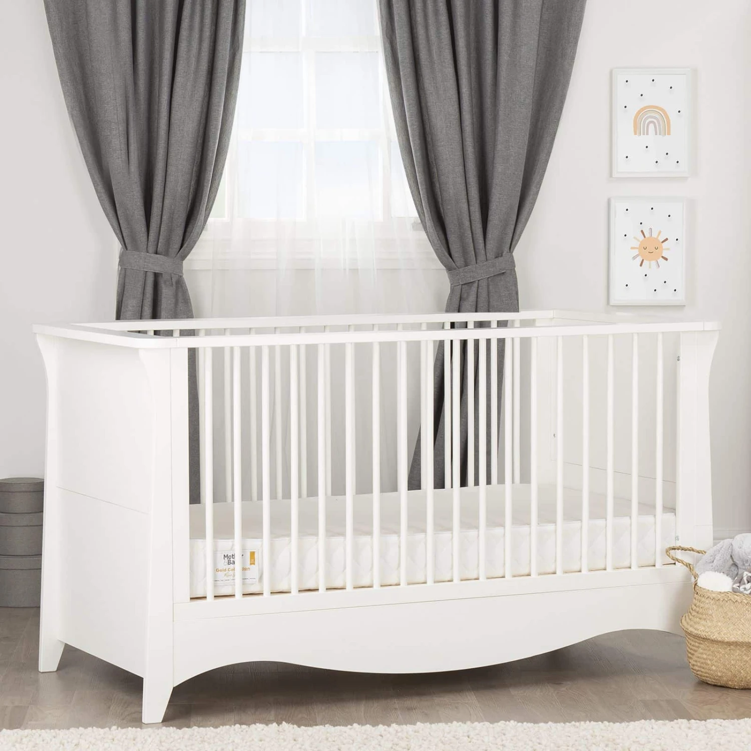 The CuddleCo Clara White Cot Bed is part of our modern Clara furniture range. Designed with 3 mattress positions, it easily converts into a modern and stylish toddler bed for years of enjoyment. The Clara Full-size cot bed is suitable from birth to about 5 years. Classic curvature with a modern contemporary look, function and style to transform any nursery.
