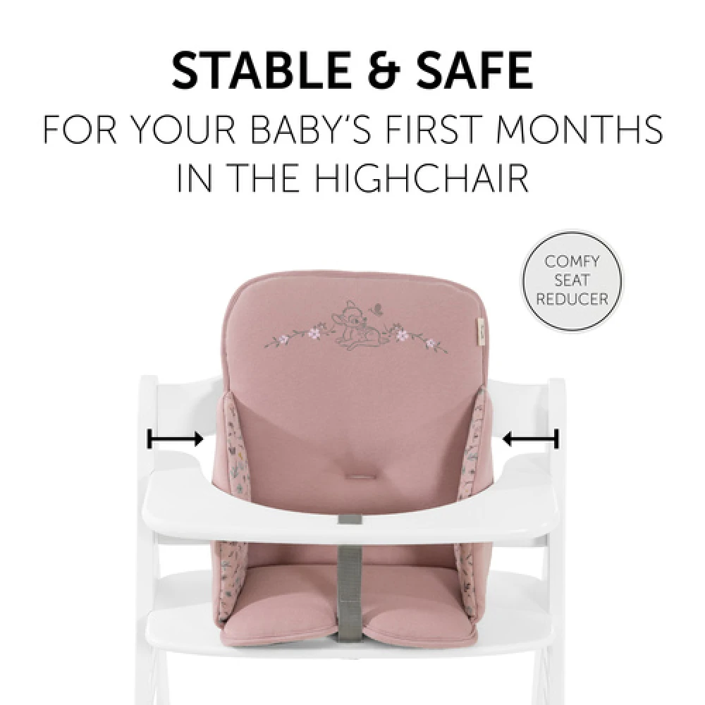 The Hauck Alpha Cosy Select – Bambi Rose is particularly useful during your toddler’s first months in the hauck wooden highchair. The practical seat reducer comes with an extra high back and reinforced sides that protect your child’s head, while also offering stability and comfort.