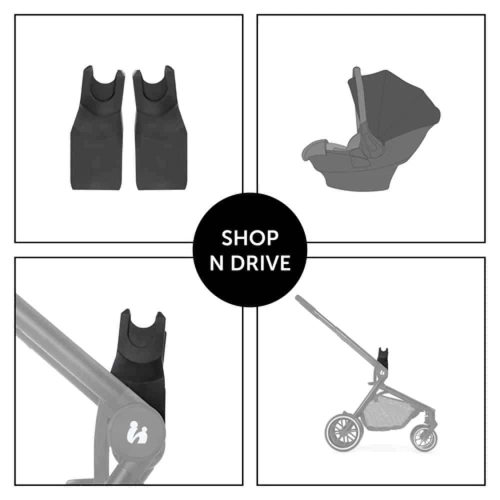 The adapters are slipped on the pushchair frame and the car seat on top of them, transforming it into a practical travel system. As a result, mom and dad can comfortably make short shopping trips and easily walk through the smallest of shops.