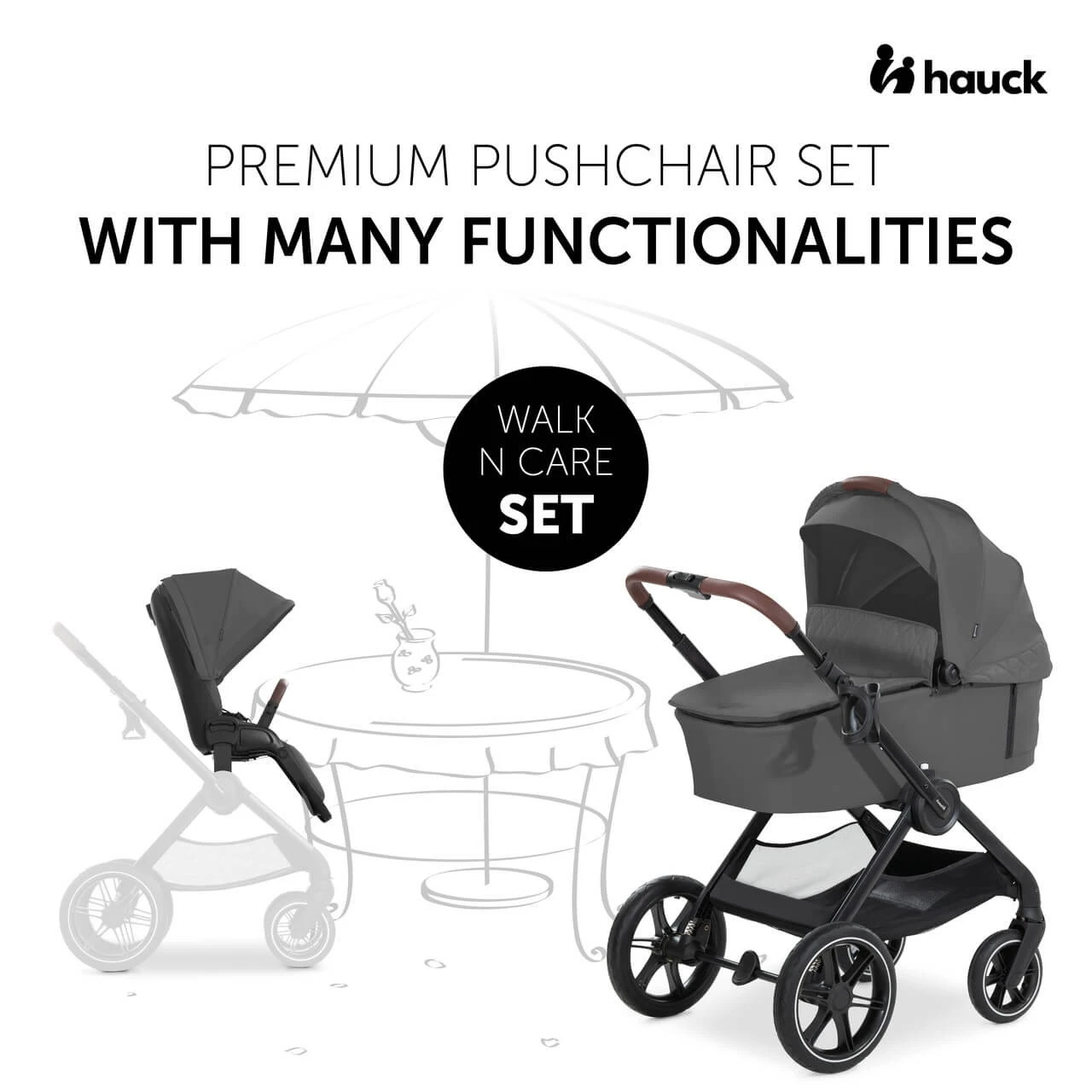 For space-saving transport, you can fold the pushchair with one hand and the carrycot to flat. You can also combine the frame with an infant car seat by hauck or other manufacturers by means of adapters, as well as with a hauck raincover or seat liner.