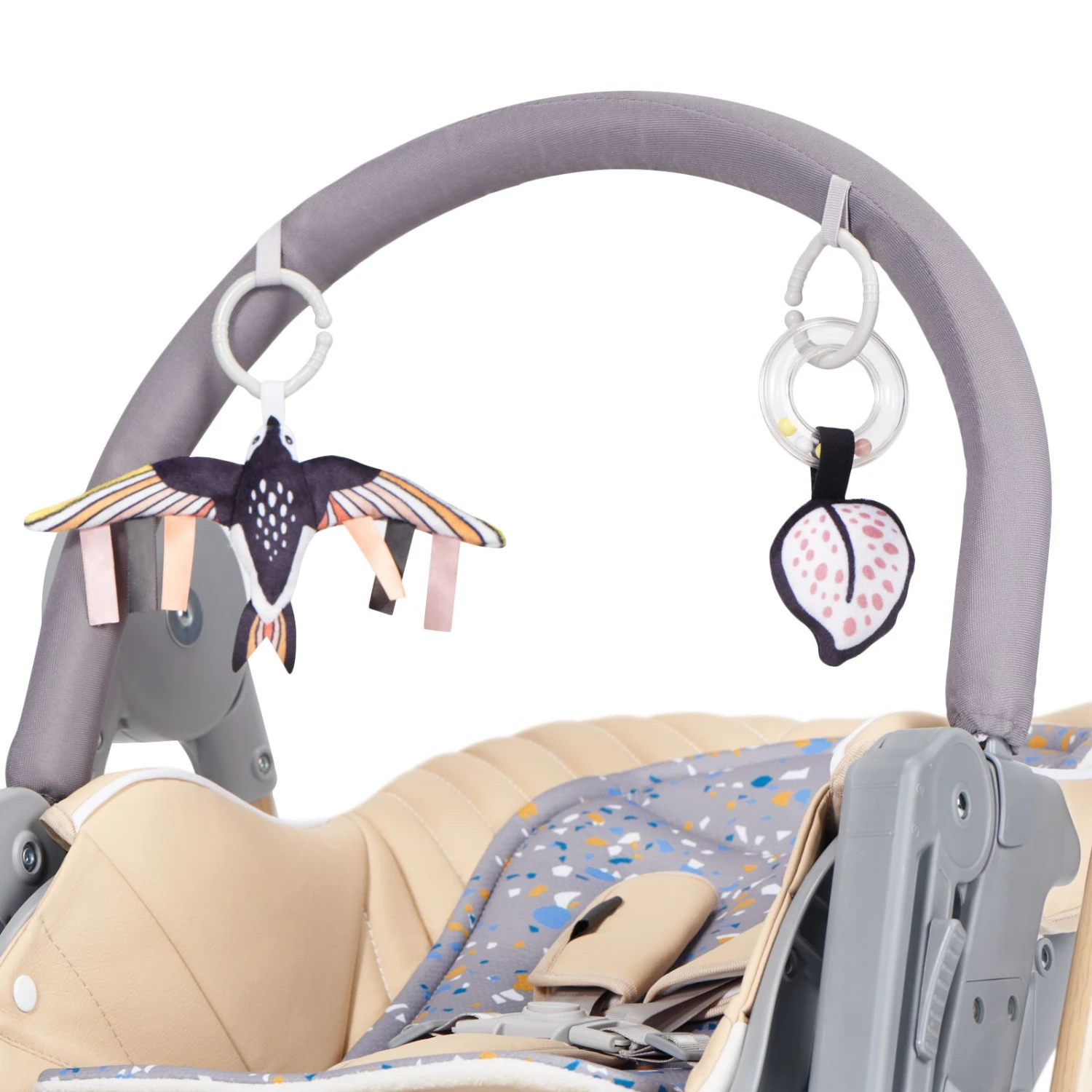The height of the seat can be adjusted to five different levels, and the additional footrest provides little feet with adequate support. The set includes a bar with two toys to interest your child and encourage them to reach out their hands.
