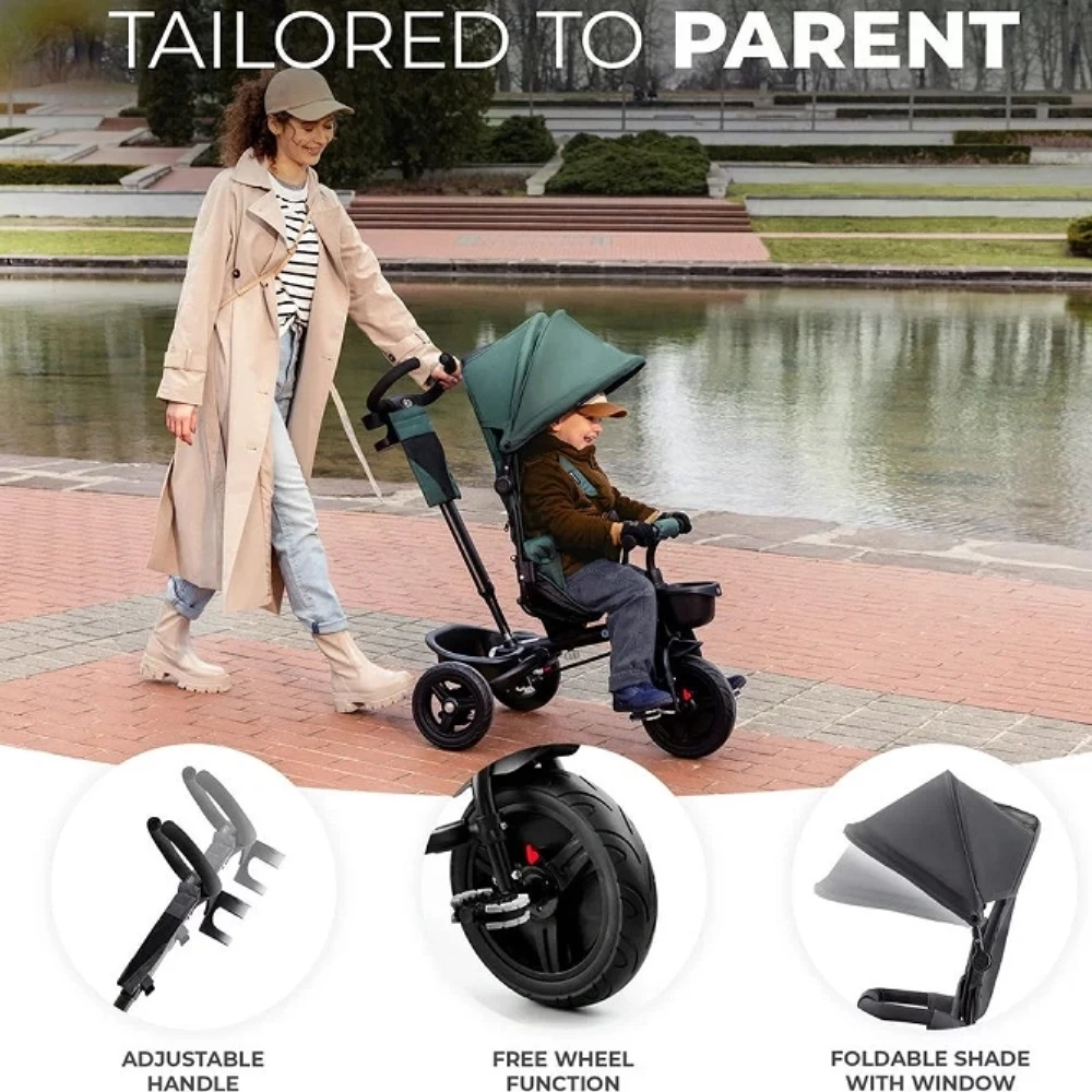 Kinderkraft Tricycle AVEO Mystic Green is a tricycle that combines fun with learning how to ride. It provides practical, convenient solutions for parents, allowing them to comfortably steer the tricycle during walks.