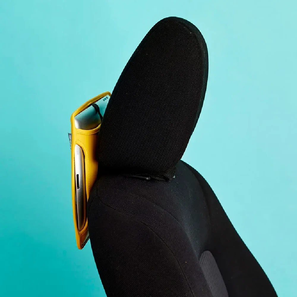 - Straps safely and securely to car headrest