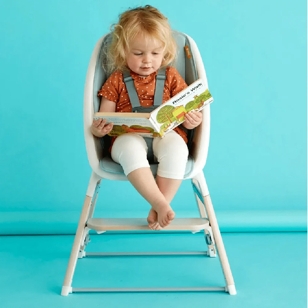 Starting with a classic highchair with a removable tray, the footplate offers 3 height positions to grow through those early eating adventures. The compact design enables you to push the seat right up to the dining table when they’re ready to dine without the tray. The chair then adapts into a toddler seat which is a great casual eating place, or a handy chair for drawing and reading. For an older child, the chair turns into a stool which has a removable harness so your child can get used to the height without the worry of tumbles at the table. Easily changed up and down and around again, with a fuss free design and simple to follow instructions.