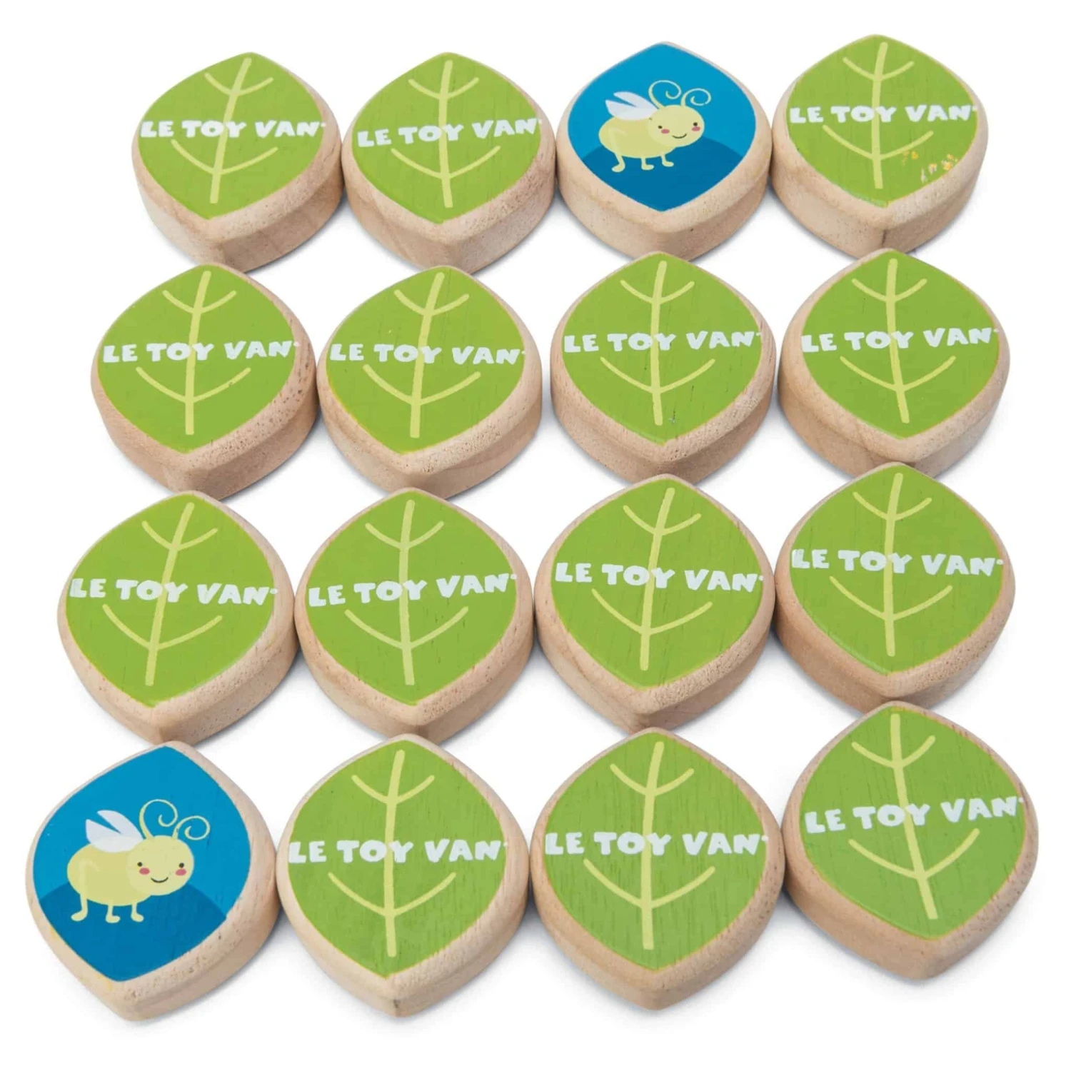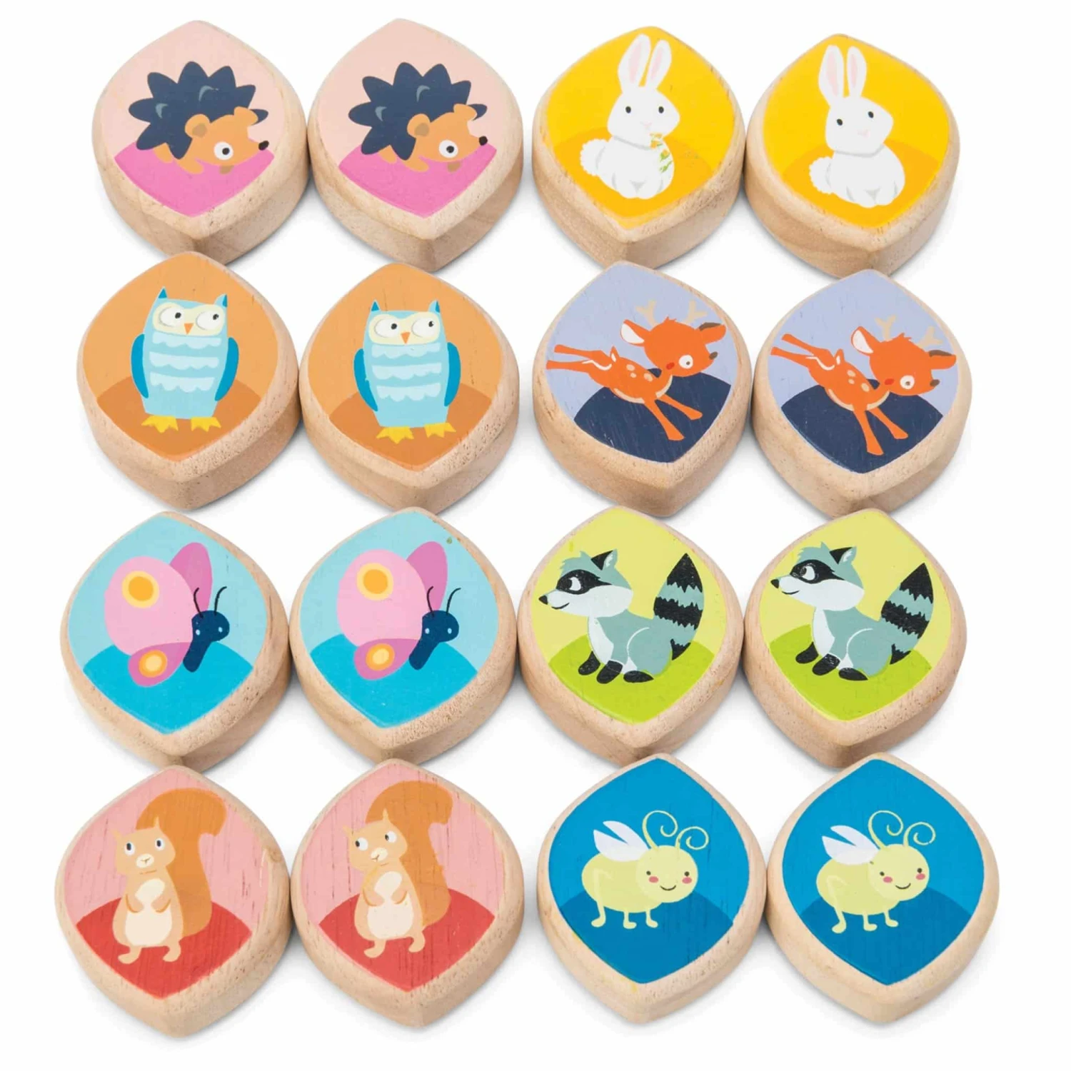 Le Toy Van Memory Game is a solid rubberwood game packaged in a gift box. Complete with, 8 pairs of animal wooden leaves and a high quality printed fabric bag. The memory game encourages social play developing speech and recognition skills.