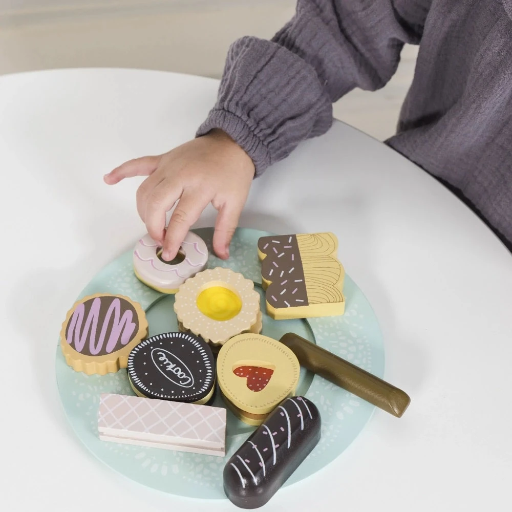 Whose for tea and biscuits? This lovely assortment of 9 ‘home-baked’ painted Le Toy Van Wooden Biscuit Set makes a delicious afternoon snack for little guests. Presented on a pretty doily patterned plate, this sweet set is sure to inspire tea-party fun and makes a great addition to the Tea & Treats Trolley.