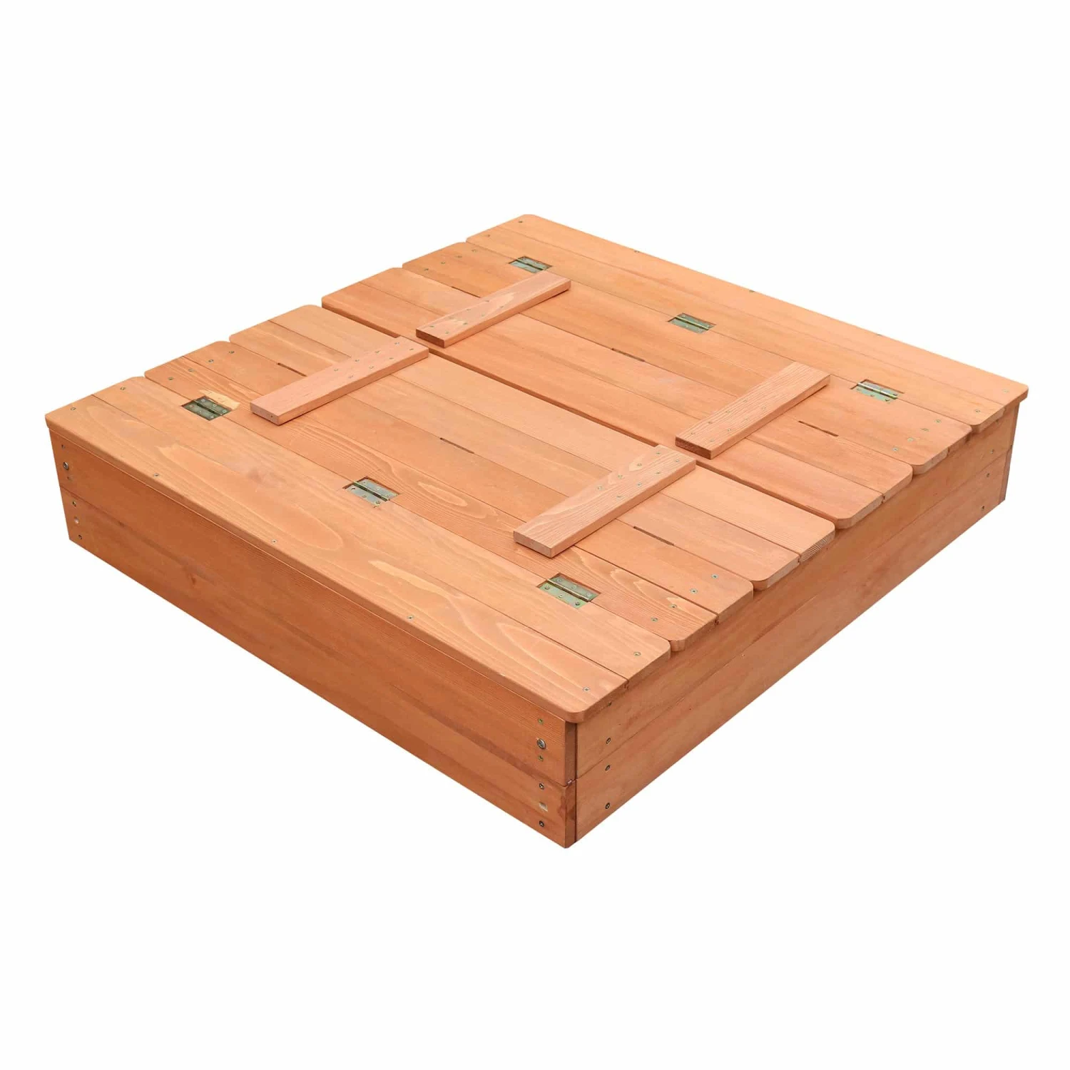 This children’s sandpit with seating and cover has a black nonwoven baseliner to prevent weeds and allows water drainage. Made from Canadian Hemlock wood which is non-allergenic and non-toxic wood. As a result, the natural wood looks great in the garden as it blends with the surroundings. The wood is from socially and environmentally responsible forests and is FSC certified.