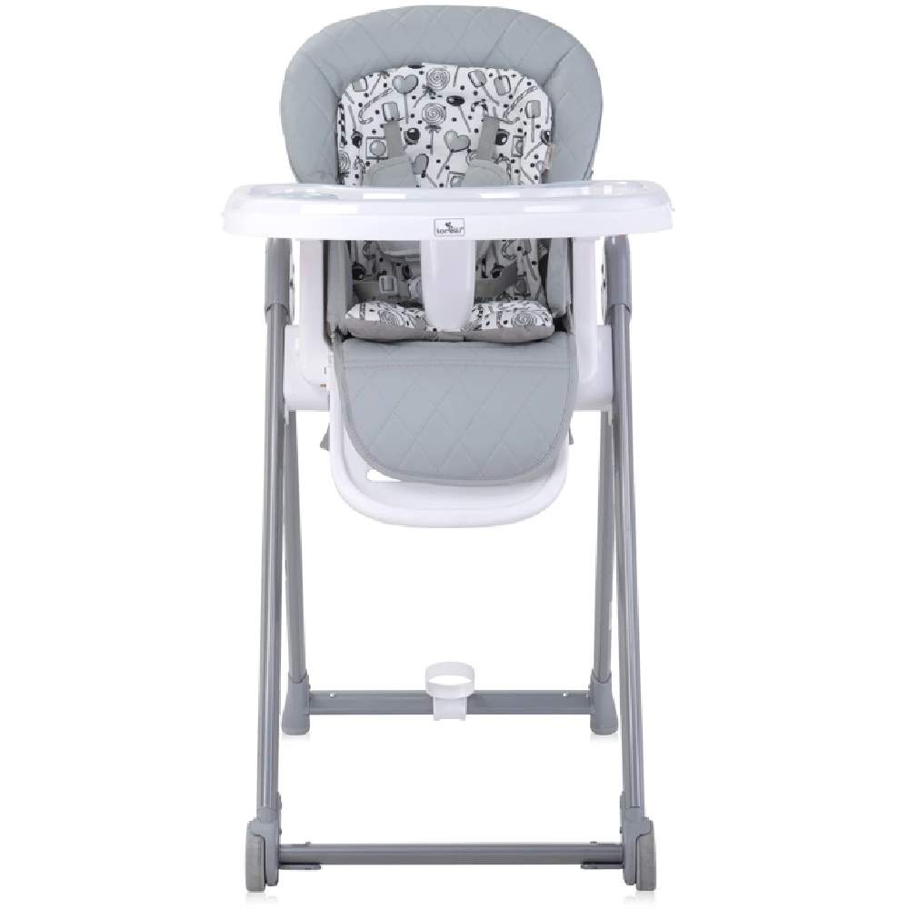 Lorelli PARTY Highchair Grey has a PVC/PU leather seat which is great for easy cleaning and a light aluminium frame. There are 2 trays, and the top tray can be removed. The two-part removable tray conveniently detaches and clips on the back of the highchair. It can be moved into 3 different positions and has a bottle/cup socket.