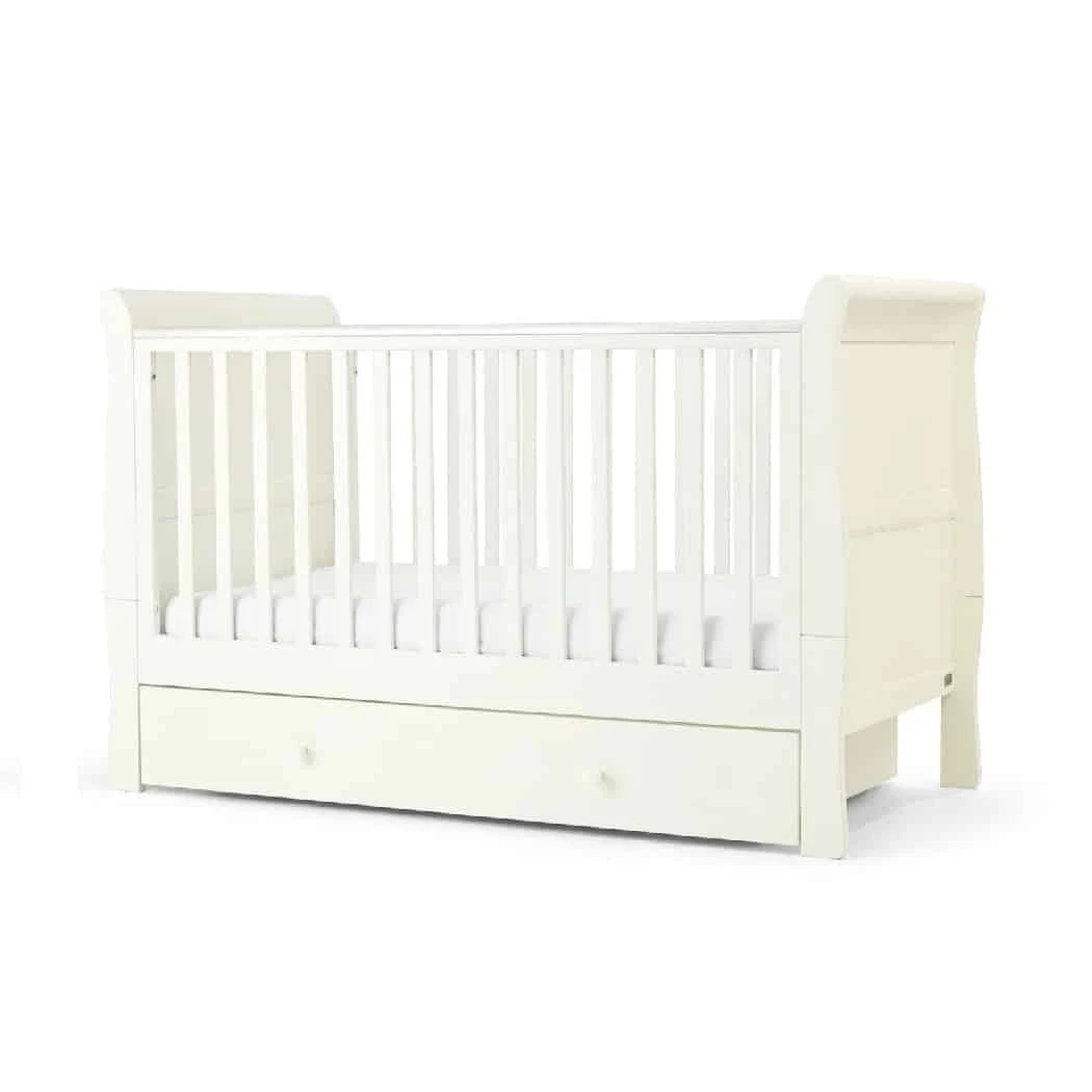 Mamas & Papas Mia Cotbed – White converts to a toddler bed that’ll keep your little one comfy until they’re around 4 years old. It comes with 2 adjustable cot base height settings, so you can easily pop baby down for a nap without disturbing them.