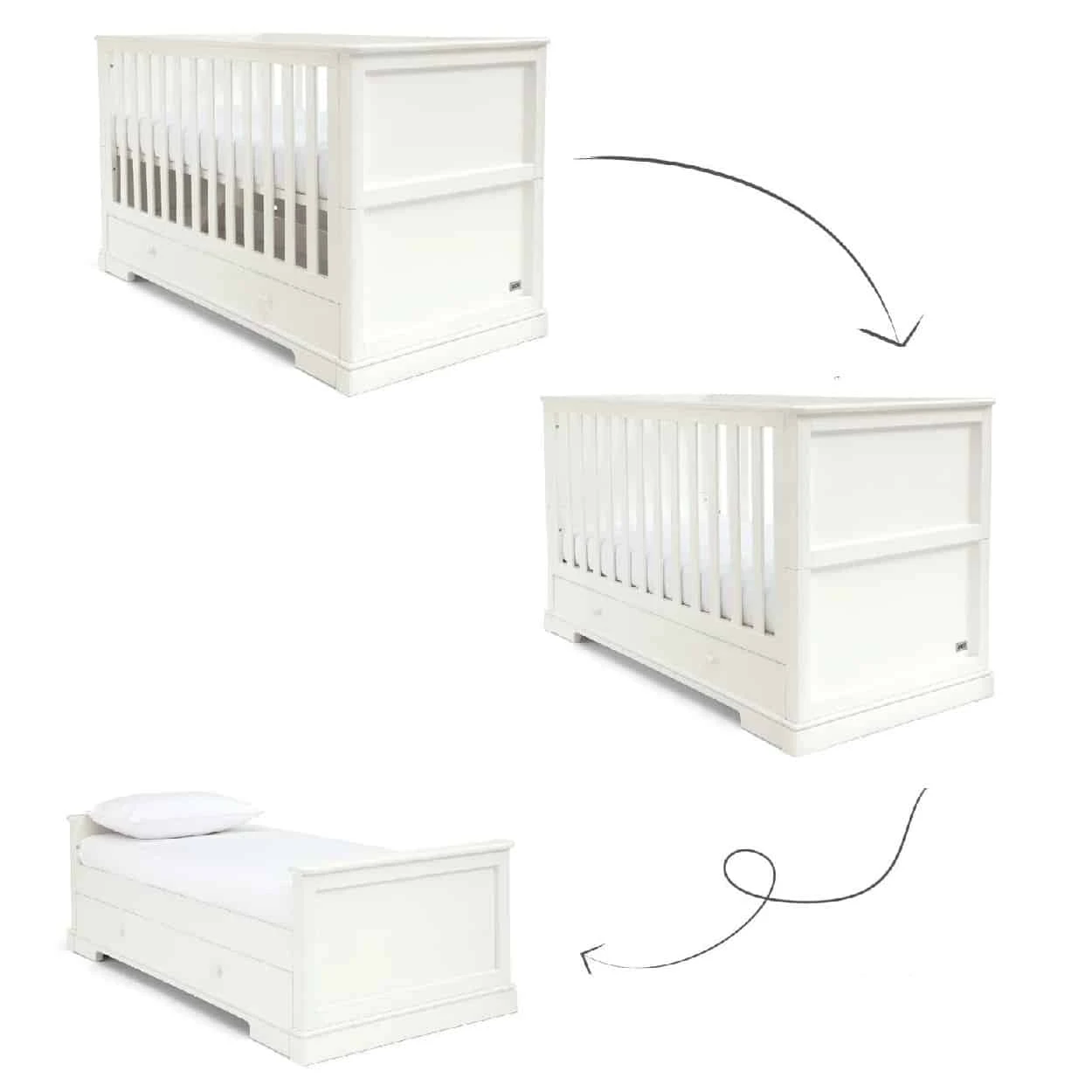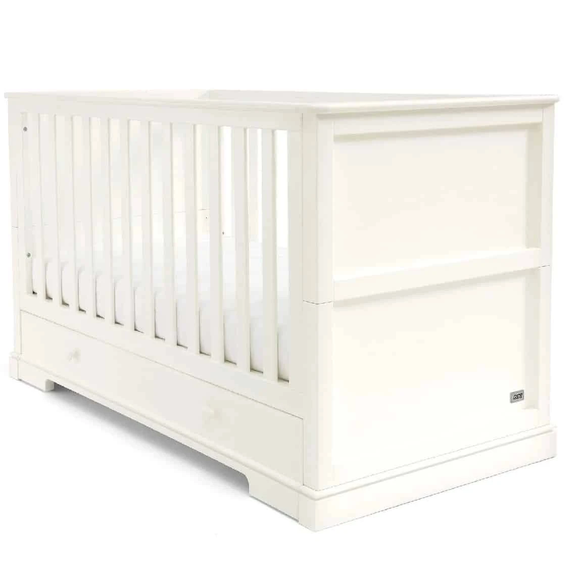 - The white cot converts into a toddler bed to extend its use