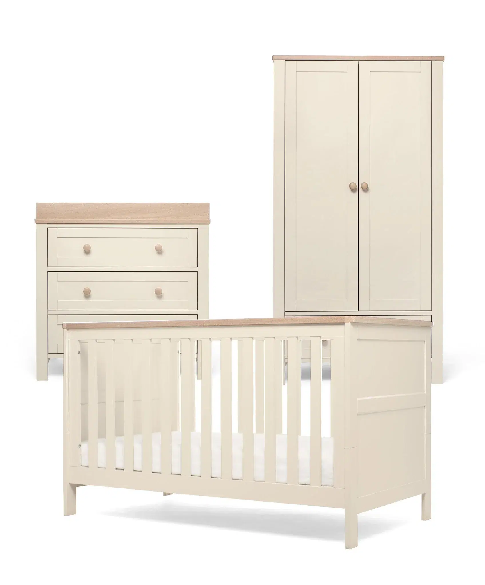 - Matching nursery cotbed, dresser and baby wardrobe comes in two-tone white with wood effect handles