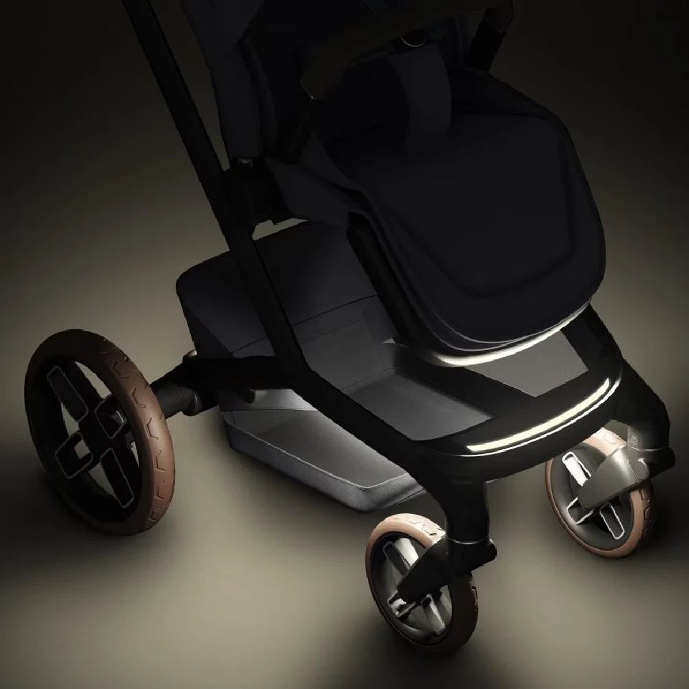 Its integrated LumiRide system with LED lighting illuminates darker streets and dimly lit pathways. Keeping you and baby safe and visible at all times. If your phone needs charging while you’re out, simply plug into the powerbank and you can power up on the go