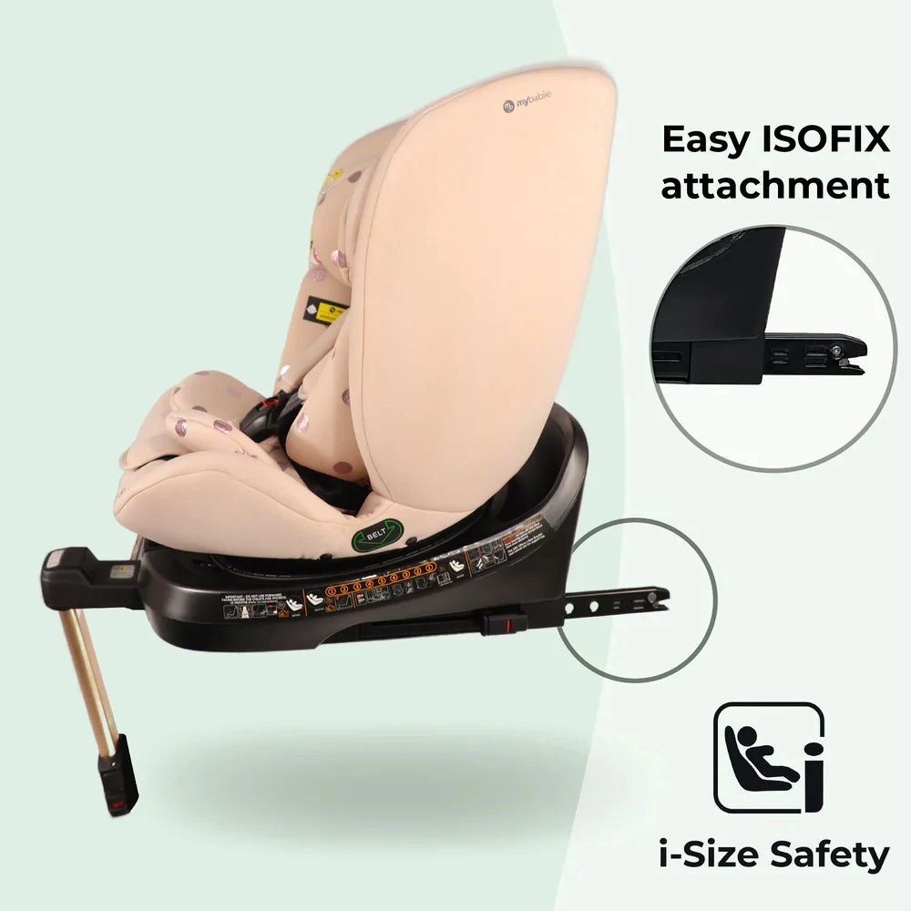 My Babiie i-Size (40-150cm) Spin Car Seat Pink Polka is an all stages car seat which means it can be used from birth up to 150cm (approx. 12 years). The seat spins to allow easy access to getting your child in and out. Benefits from an extended rear facing seating position, meaning your child can stay rear facing up to 105cm (approx. 4 years).