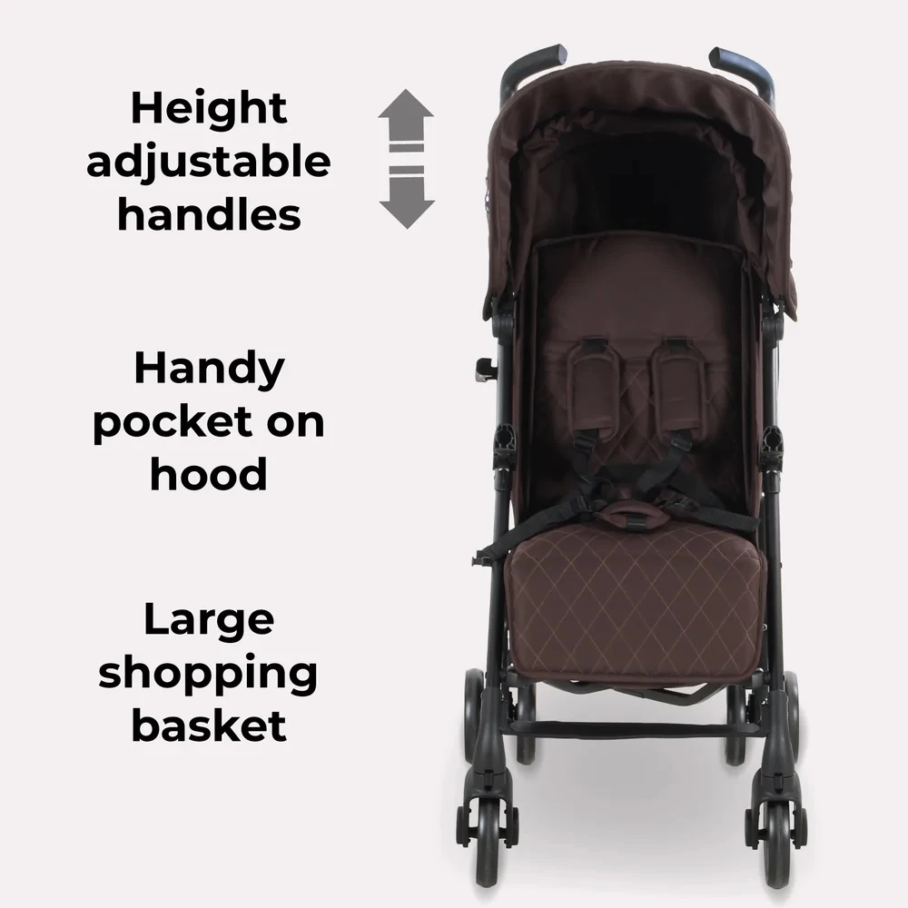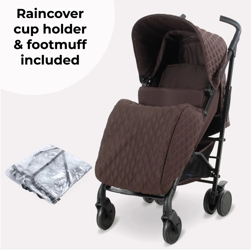 This stylish My Babiie Plus Stroller Quilted Chocolate combines the style and function you expect from a super talented mum. This lightweight stroller comes with a free cosy footmuff, cup holder and rain cover
