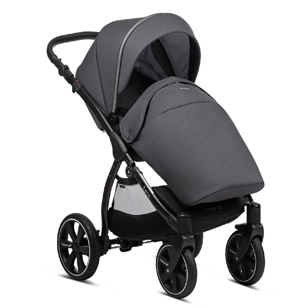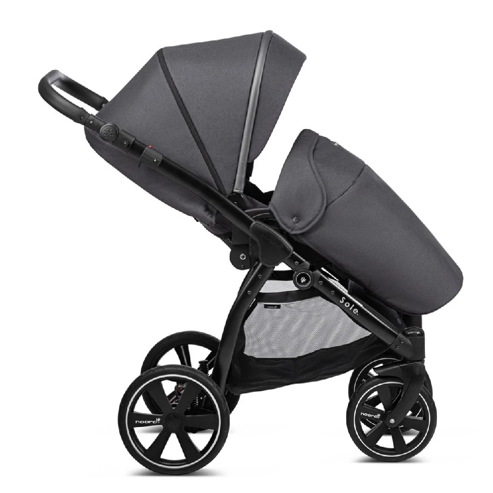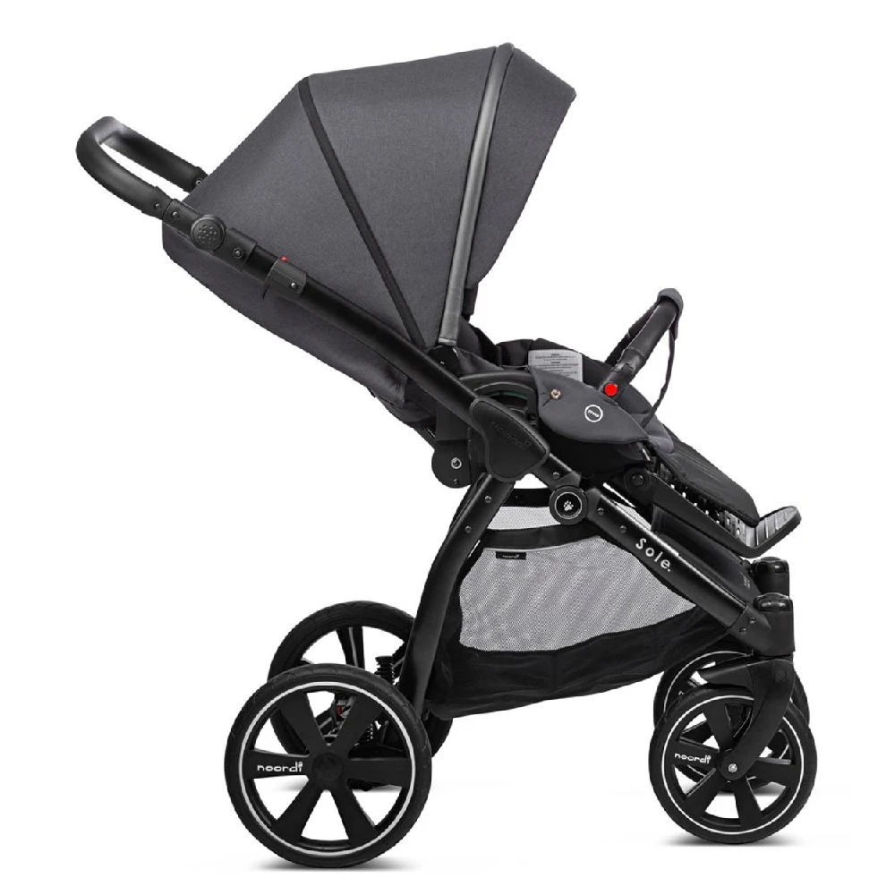 The compact Noordi Sole Go 3in1 Travel System – Black will be the best choice for parents who are like to take offroad strolls. Durable aluminium chassis with Real-Gel™ wheels and adjustable shock absorption system ensures excellent ride on any terrain like forest trails, sand or snow. The One-Click™ braking system ensures the highest safety. The handlebar with luxe eco-leather grips can be adapted to match your height. Extra-large shopping bag allows you to put in your baby’s essentials.