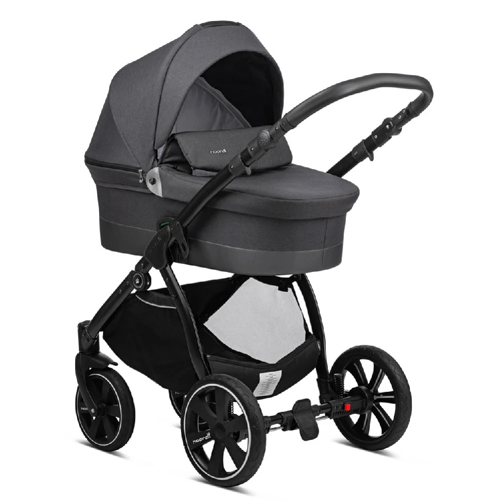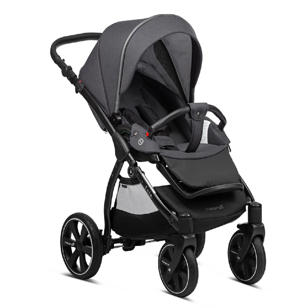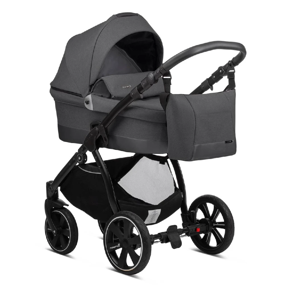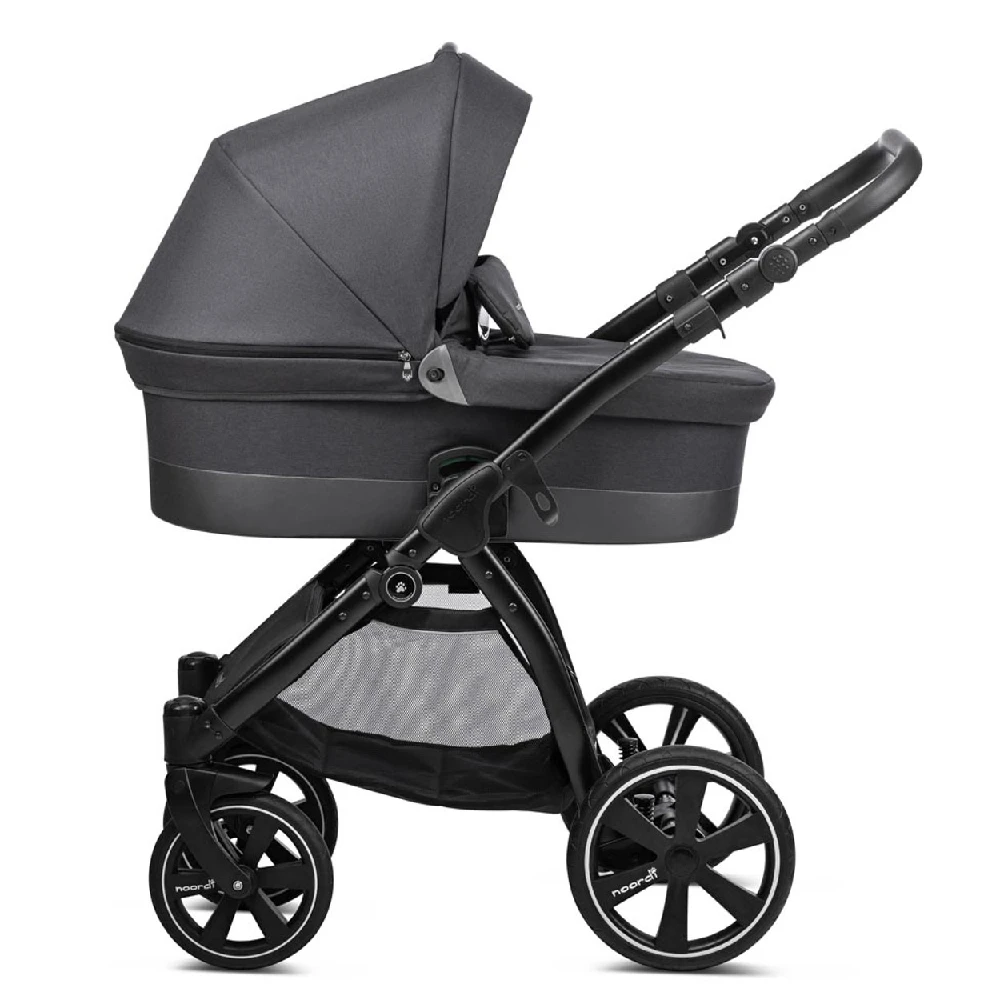 The compact Noordi Sole Go 3in1 Travel System – Black will be the best choice for parents who are like to take offroad strolls. Durable aluminium chassis with Real-Gel™ wheels and adjustable shock absorption system ensures excellent ride on any terrain like forest trails, sand or snow. The One-Click™ braking system ensures the highest safety. The handlebar with luxe eco-leather grips can be adapted to match your height. Extra-large shopping bag allows you to put in your baby’s essentials.