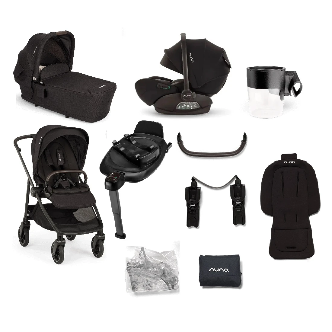 Nuna Swiv Stroller Bundle Caviar has everything you need, it includes Pushchair, Carrycot, carseat, base, cup holder, rain cover, carry bag and travel system adaptor.