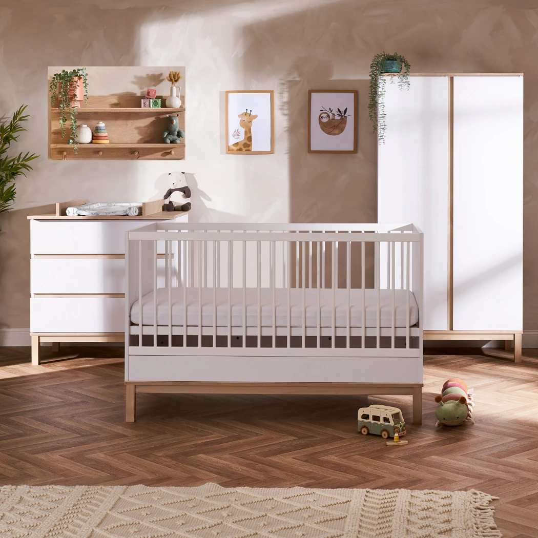 Obaby Astrid 5 Piece Nursery Room Set/Shelf/Mattress – White/Oak Features