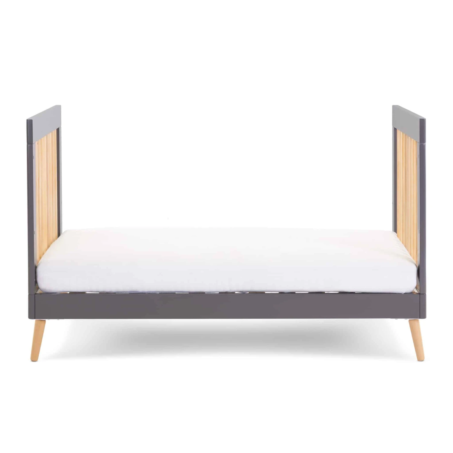 Suitable from birth, the Maya cot bed will grow with your little one. The top position of the three height-adjustable mattress base allows you to put down your baby with less pressure and strain applied to your back and as they develop and start to find their feet, you can maintain their safety by lowering the base. When your little one is ready to begin their transition, the included dual ended safety rail will provide reassurance and familiarity during an often daunting time and once they are used to their “big bed” this can be simply removed to create a stylish toddler bed.