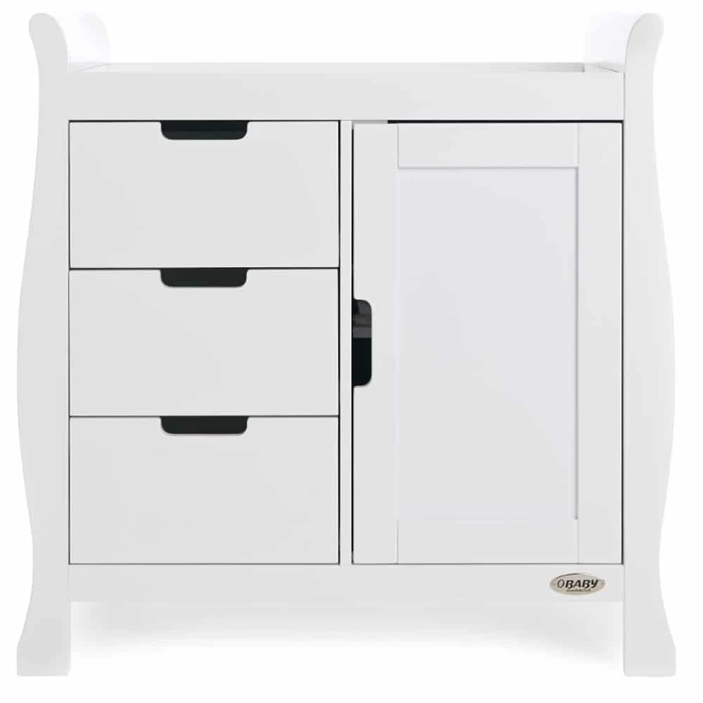Also part of the furniture set, the beautiful changing unit is crafted using solid wood and features the same elegant scroll design that flows through the rest of the Stamford range. Sleek lines and recessed handles create a stylish and uncluttered look, whilst ensuring it remains snag free and simple to use. It’s combination of three full depth drawers and full height cupboard with adjustable shelf and soft close door provide plenty of storage options for little one’s precious belongings, whilst the cleverly recessed section on the top of the perfectly accommodates a changing mat.