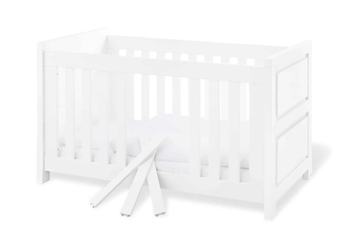 - 3-part set – the perfect initial equipment for the trendy baby room consisting of a cot with 3 rungs including conversion sides, extra-wide changing table with changing attachment and a wardrobe, made of matt lacquered MDF, white