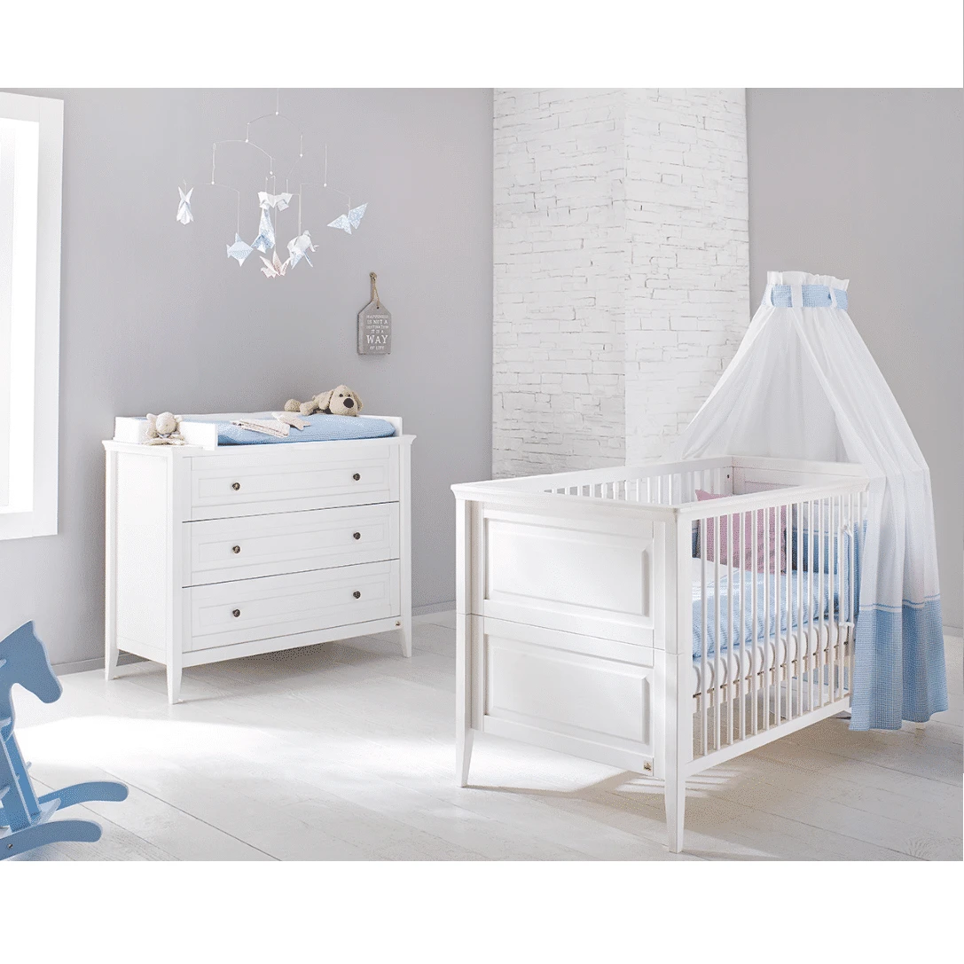 The slatted base of the cot is 3-times height adjustable and the conversion sides for the conversion to the junior bed and children’s sofa are already included – so the bed can be used for years