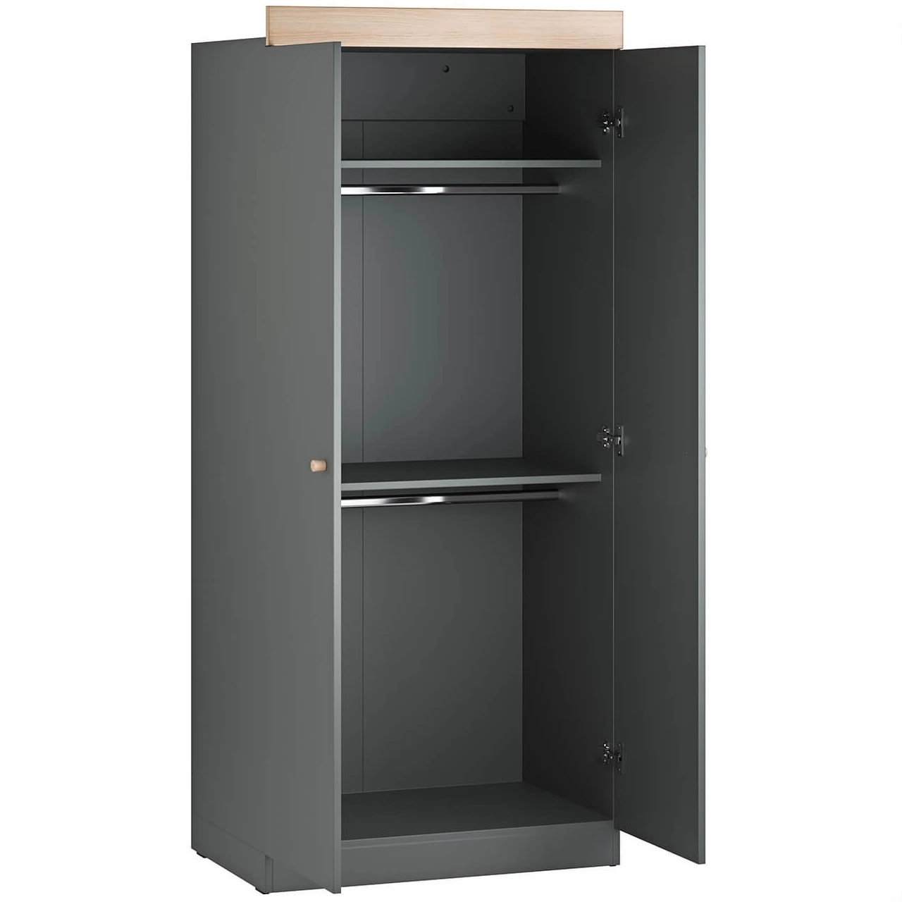 The two door wardrobe has attractive oak styling and includes two shelves and two hanging rails for all your little ones outfits. The middle shelf and rail are removeable to enable you to use the wardrobe for longer and your little ones outfits get bigger.