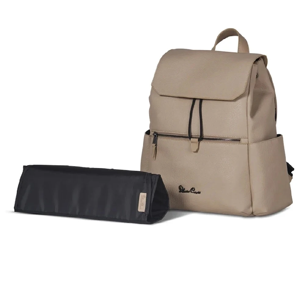Coordinating vegan leather changing backpack, thermal puffer jacket-style footmuff, cup holder and phone holder.