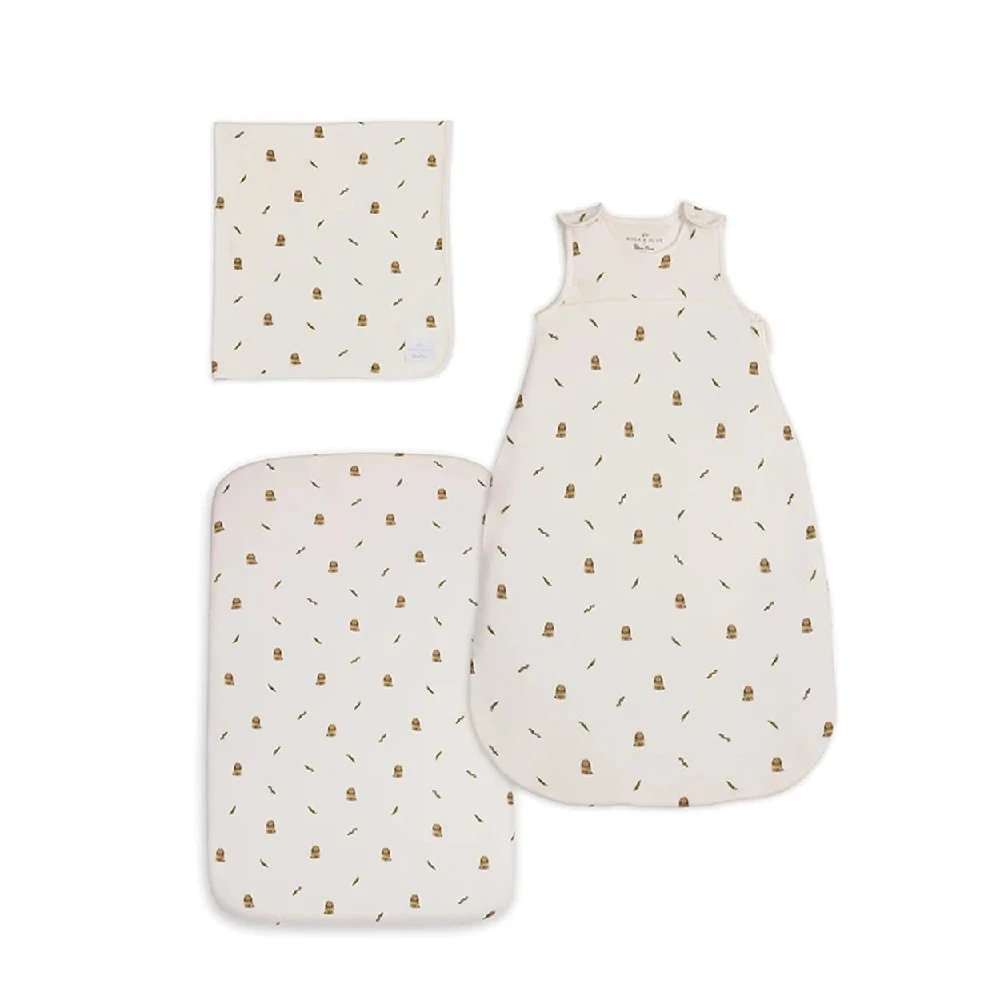 Gift set includes a bedside crib fitted sheet (50cm x 83cm), blanket (80cm x 90cm) and 1.5 tog sleeping bag (3-24 months).