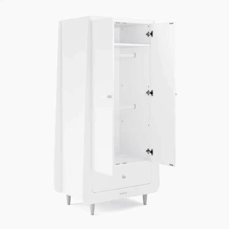 The matching dresser and double wardrobe will complete the look beautifully the dresser has three built in drawers to hold all of your little ones essentials and the wardrobe features adjustable shelving and rails with a large drawer for bedding and essentials.