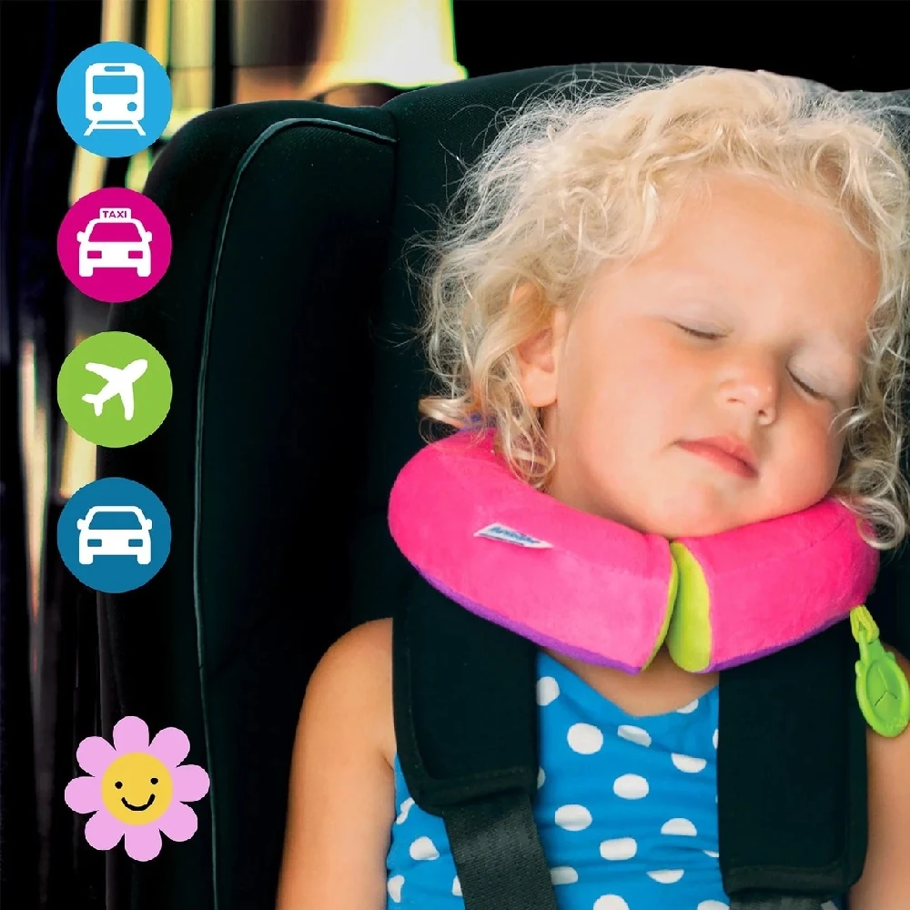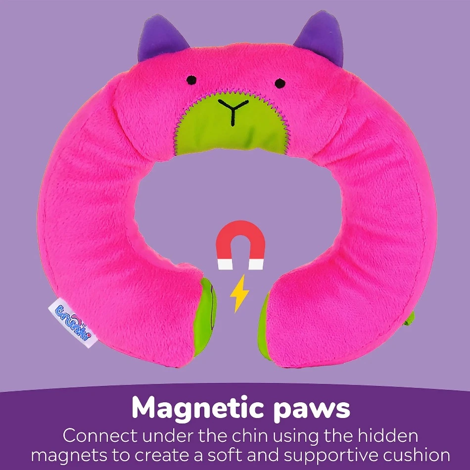 Trunki Yondi Travel Neck Pillow – Betsy is a specially designed travel pillow that connects under the chin with hidden magnets to form a soft and supportive cushion. This stops your child’s head rolling forward so they can snooze in comfort.