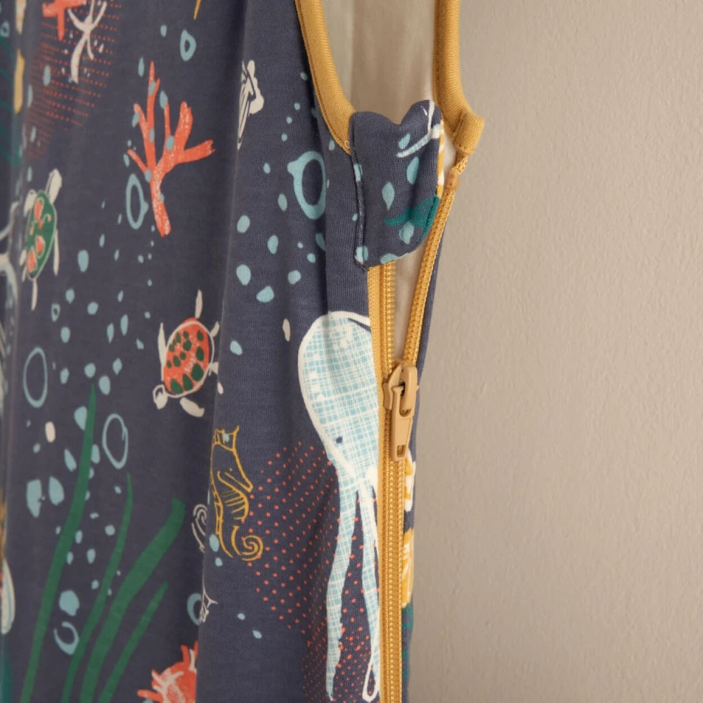 Our sleeping bags are uniquely designed with an intricate print of octopus, jellyfish, seahorses, crabs and turtles to carry on the aesthetic of the collection.