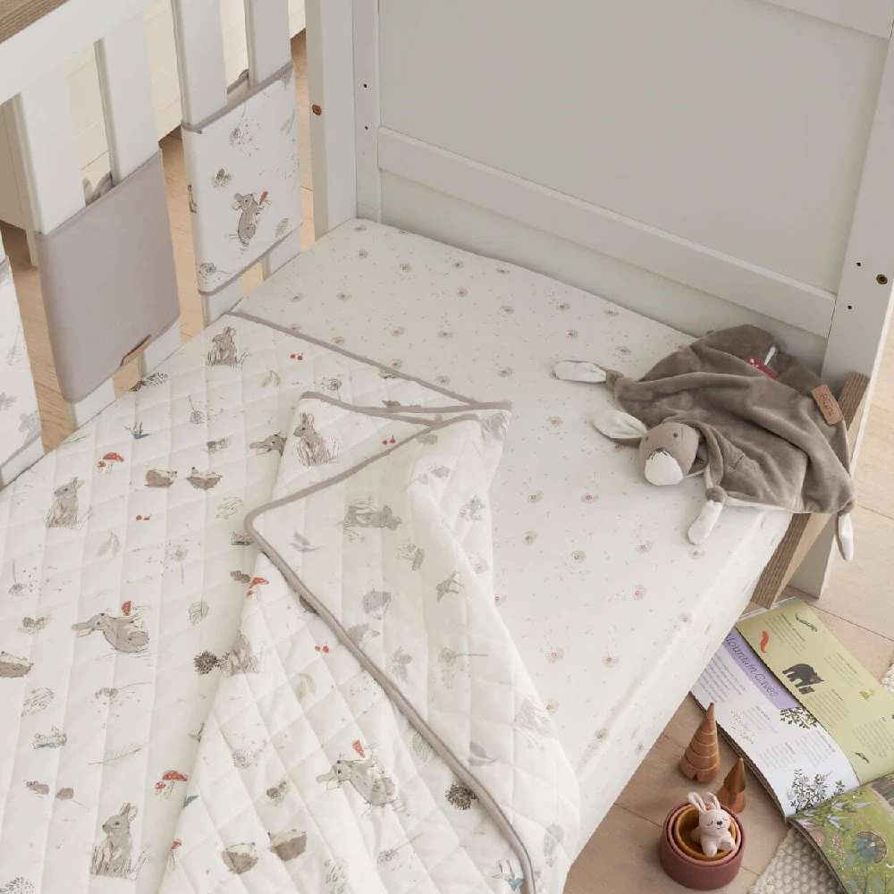 The Cocoon cot and cot bed coverlets are quilted and beautifully designed with illustrative frolicking bunnies to carry on the aesthetic of the collection.