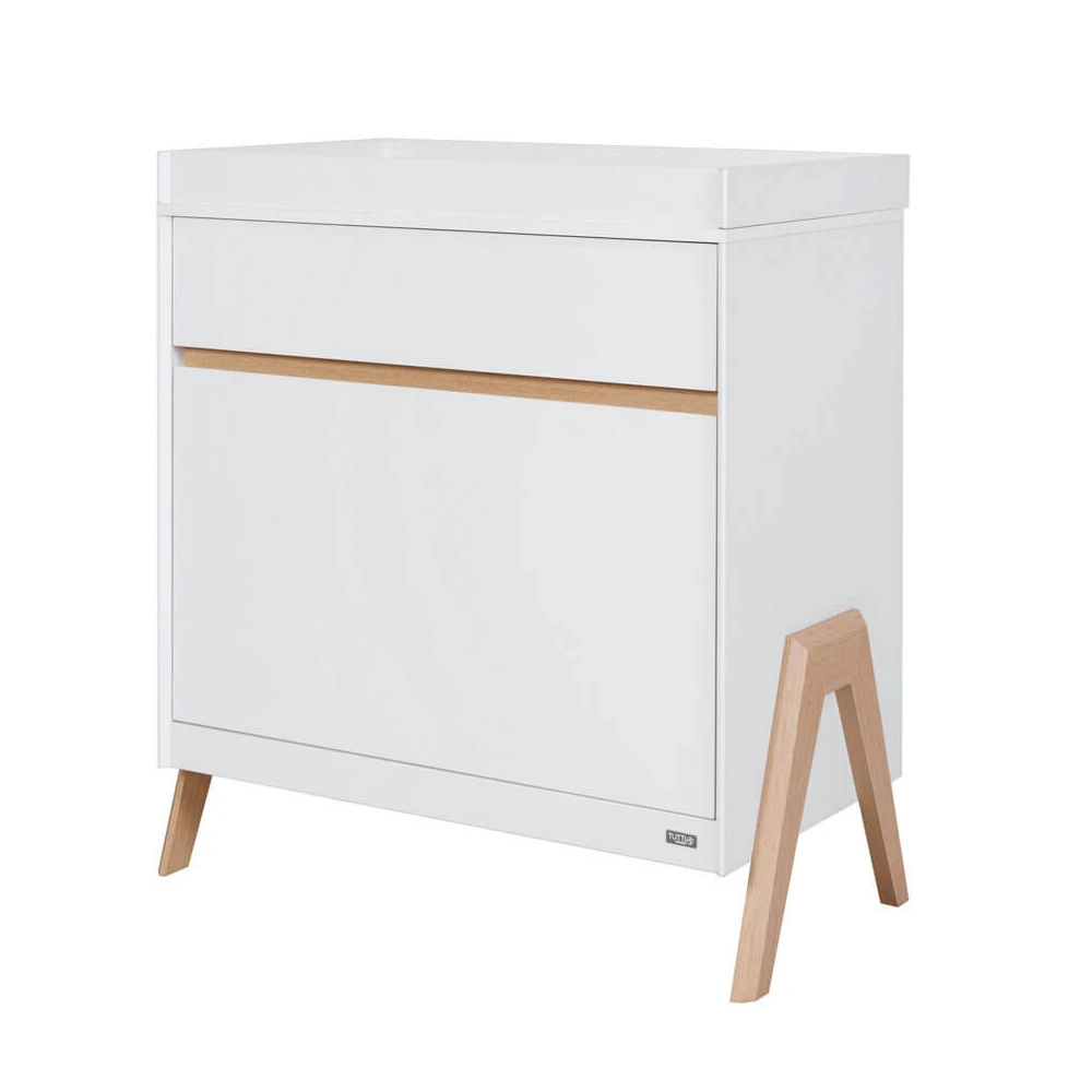 Tutti Bambini Fuori 2 Piece Room Set White & Light Oak is a Scandinavian-inspired blend of modern simplicity and functionality. With exposed legs and a sleek appearance, it’s an ideal choice for those who desire a clean, contemporary nursery look.