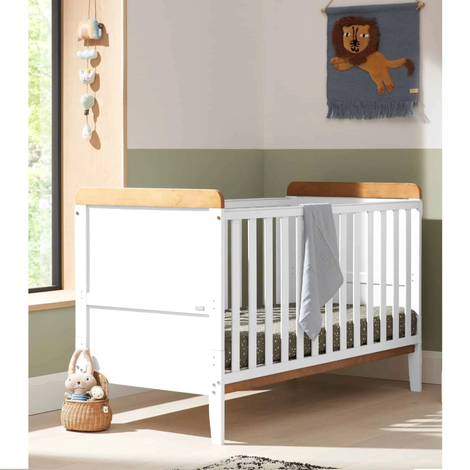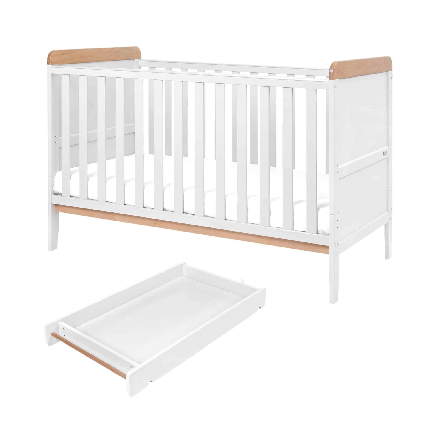The Tutti Bambini Napoli Cot Bed – White/Oak is a contemporary cot bed complete with matching cot top changer.