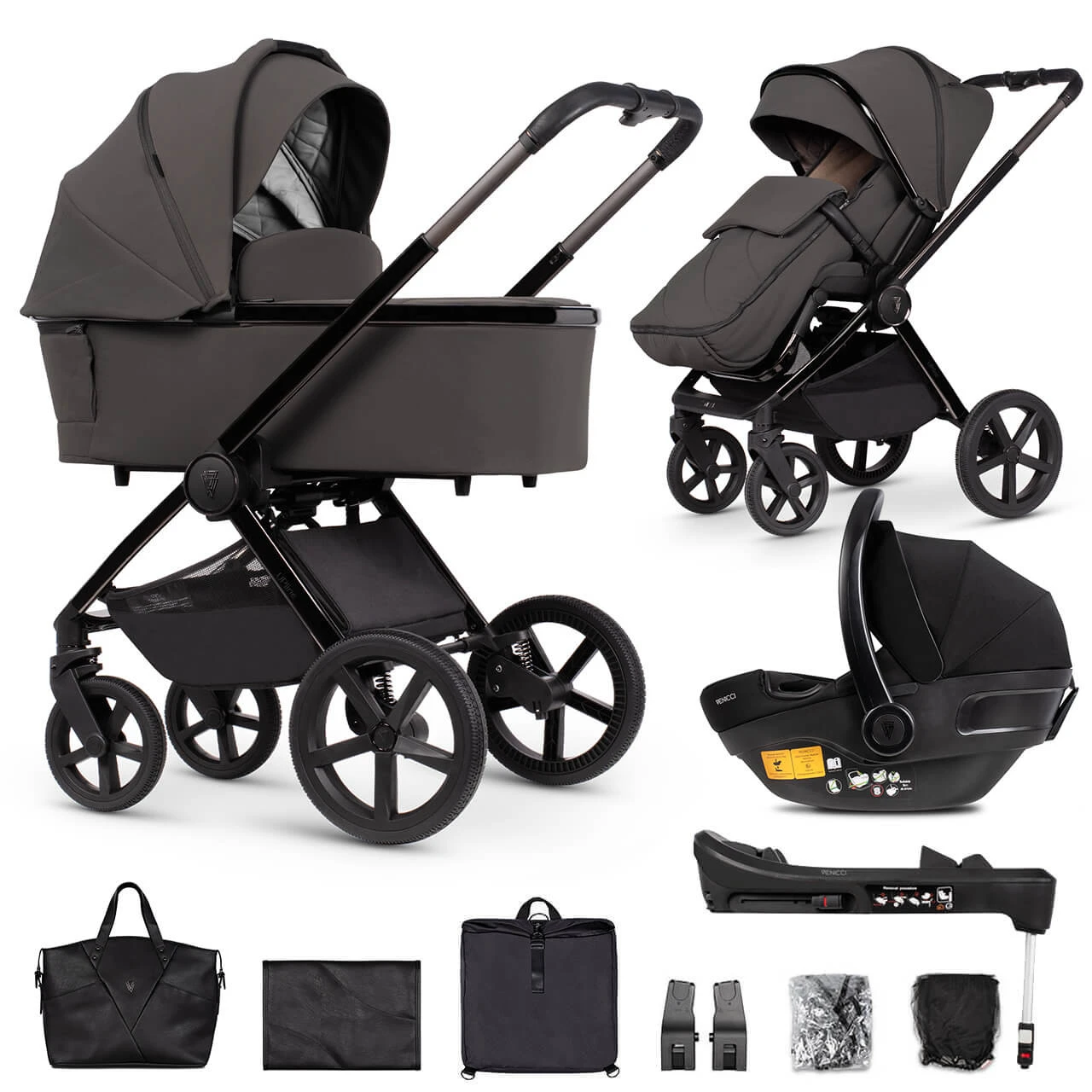 - All-in 12- piece bundle including eco-leather changing bag, changing mat, shopping bag, footmuff, raincover, mosquito net and Venicci Engo i-Size car seat with adaptors and Isofix Base
